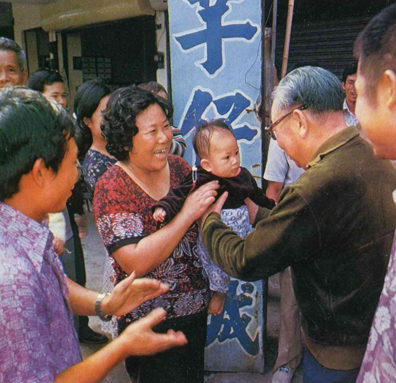 總統訪問六龜鄉的山地育幼院,慈愛地與育幼院內的小朋友交談。