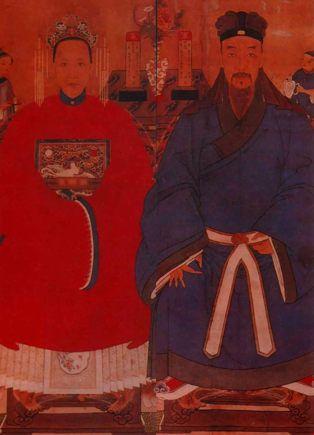 一幅明朝留下的祖宗畫像,斯文儒雅的老帥哥,留著三吋長的尖指甲,與身旁精心打扮的老伴,看來很登對。(國立台灣藝術教育館提供)
