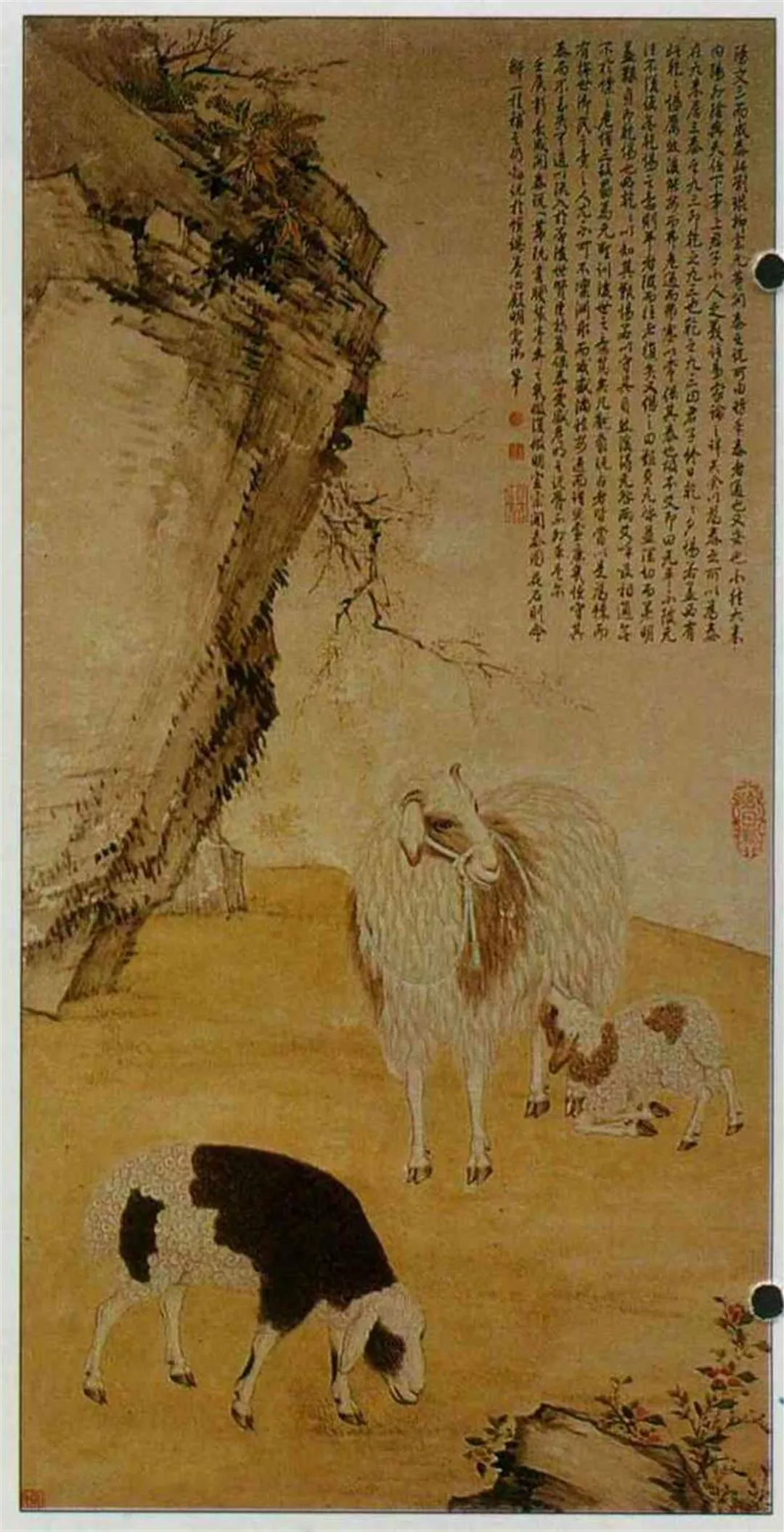 清高宗乾隆所作的「御筆開泰說並仿明宣宗開泰圖」。乾隆在右上角題有「開泰說」,為三羊開泰之意。(故宮博物院提供)
