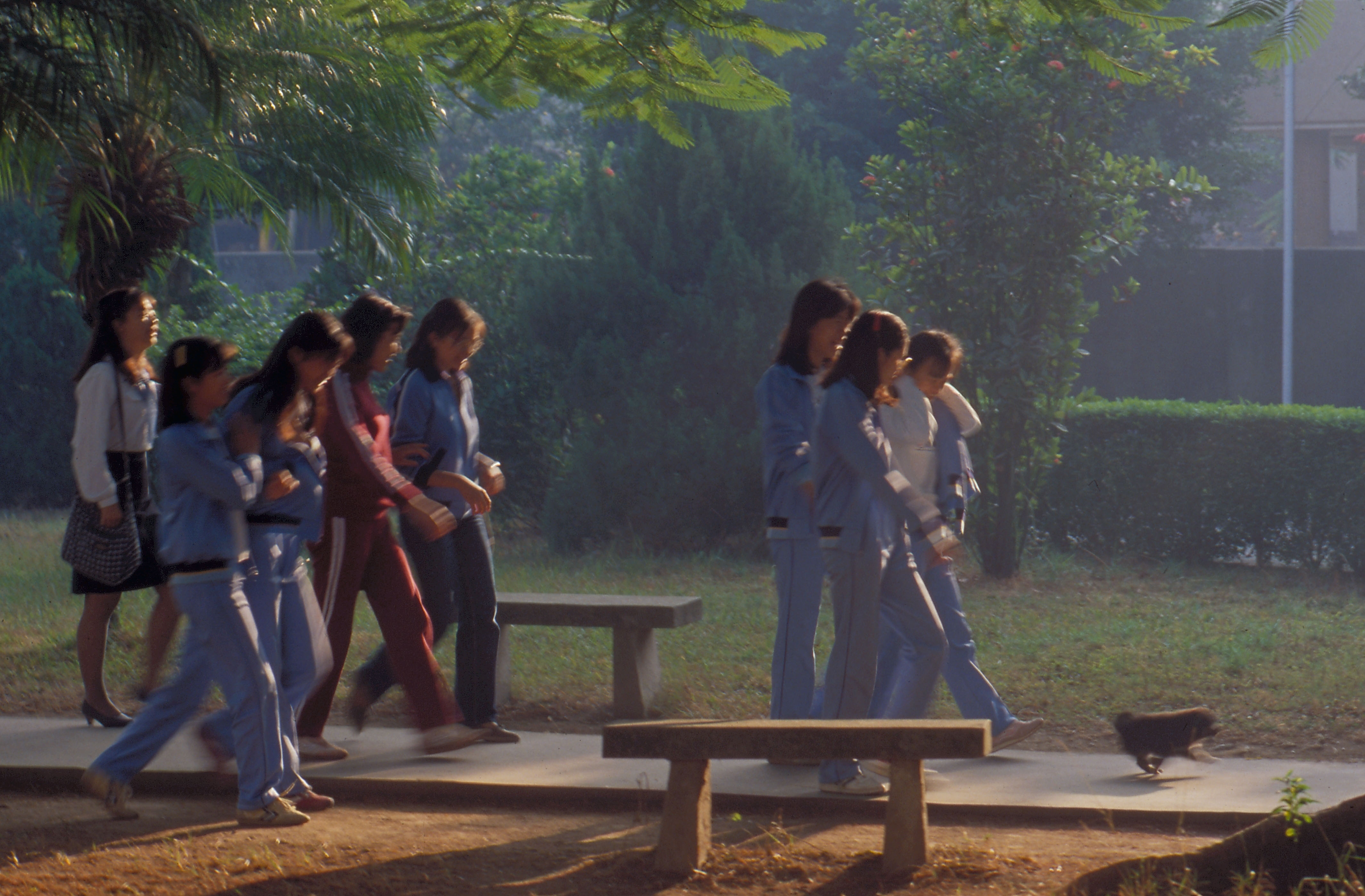 操場上是另一幅美麗的畫面。校方規定體育課必須穿指定顏色的運動服,以免上起課來五顏六色,使原本就已狹小的操場更為零亂。各年級體育服裝顏色不同,於是粉紅、翠綠、嫩黃、水藍滿場跑,亂中有序,卻也不失美感。