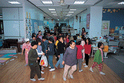 永安的教室,也不是普通的班級教室,而是所謂的「班群空間」──約四十公尺長、十二公尺寬的大空間裡,用活動隔板劃成了幾個區域:靠內側的四大隔間相當於四間教室,中間是一條寬廣的活動走道,外側臨著地磚走廊的空間裡,則排放著櫥櫃、衣架、電腦區、圖書區。下課時,孩子們就擠在電腦前上網找資料、玩遊戲,讓資訊融入時時刻刻的學習中。隔板上,則貼滿了孩子的各類習作,每個孩子都有發表機會。