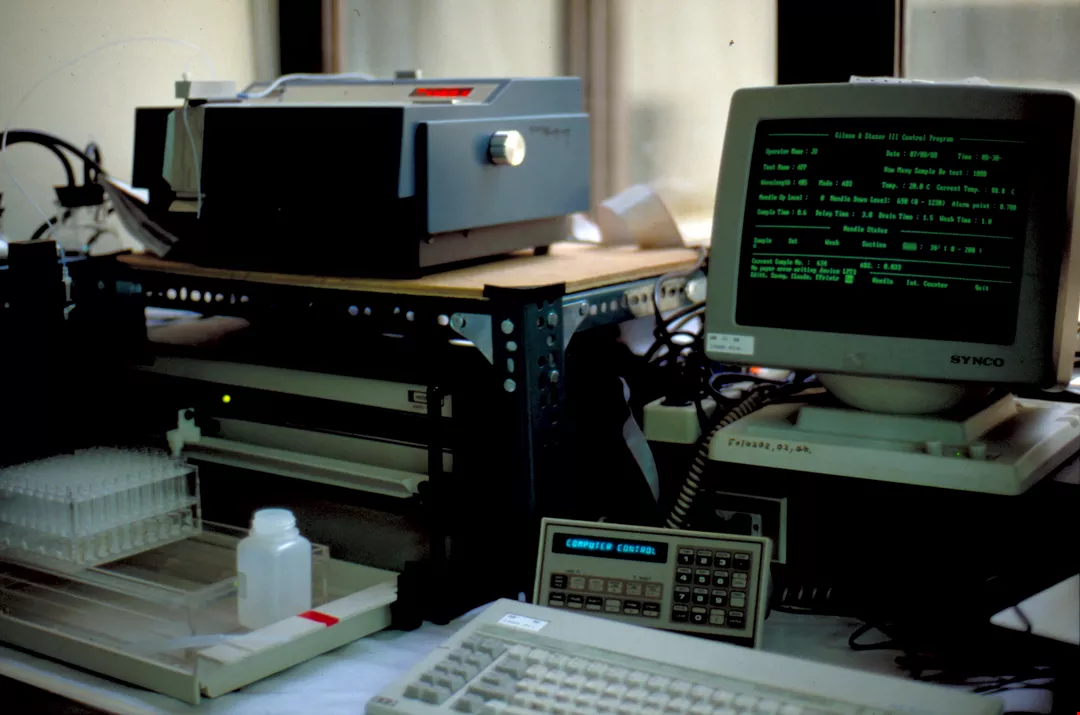 這一套儀器,可以自動讀寫檢驗結果,是榮總進行肝癌大眾篩檢計畫的利器。(陳品君)