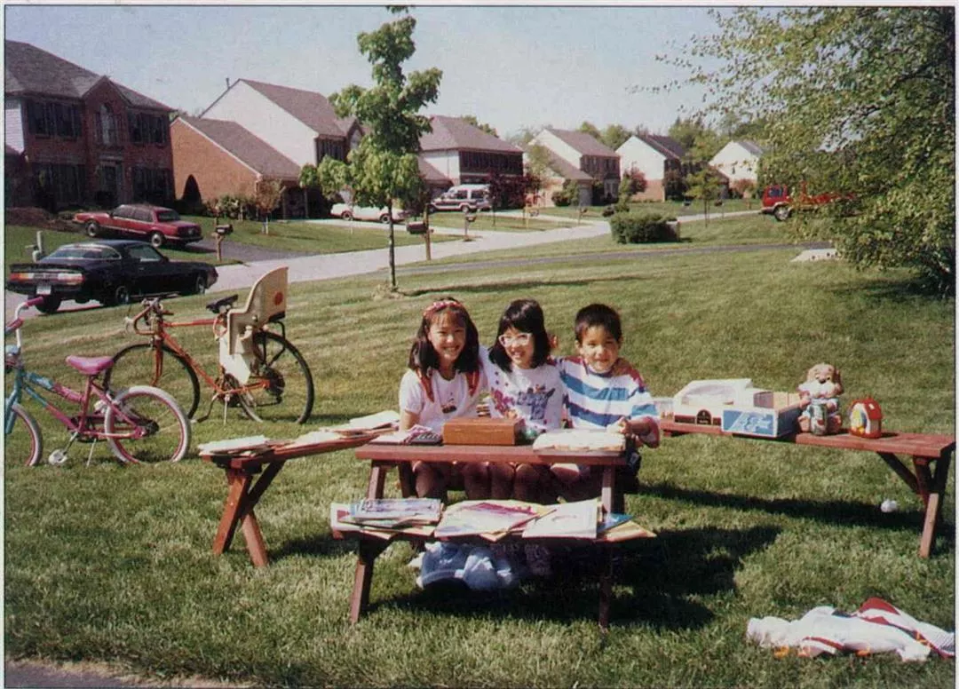 這是美國的家。回台灣前,舉辦了一次車庫大拍賣,小茜(左一)也在鄰居小朋友的幫忙下,把不要的玩具、書籍拿出來大清倉。(蔣小偉提供)(蔣小偉提供)