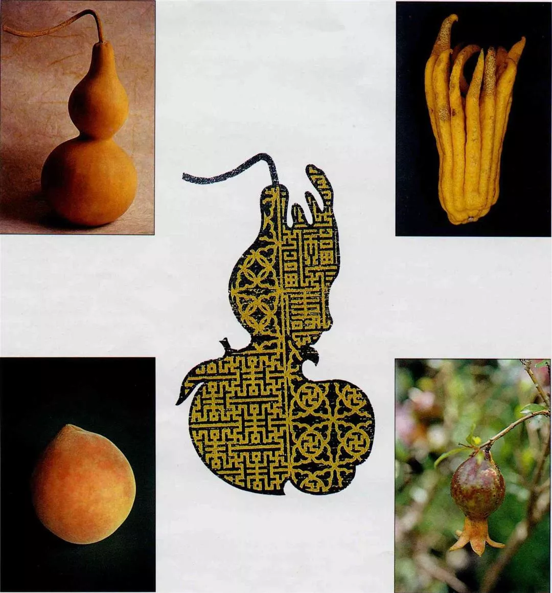 佛手→取其諧音福壽 葫蘆→取其諧音福祿 石榴→多子多孫、瓜瓞綿綿 桃子→壽桃長壽 福祿雙全 瓜瓞綿綿。(薛繼光)