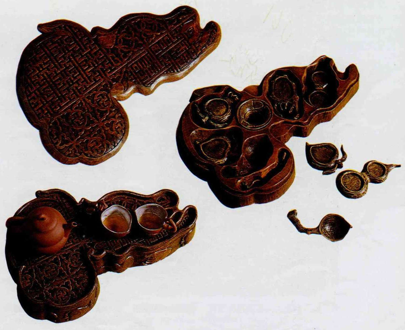 坐下來喝口茶,一對粉青的杯子上印著寶藍的富貴二字,吉利的字鑲嵌在象徵薪火相傳的香爐和如意紋內。擺糕餅的木盒仔細一看,原來有葫蘆(福祿)、佛手(福壽)、桃子(長壽)、石榴(多子)四種水果型組成,上面刻有相同意義的裝飾圖案。這些寓有傳統吉祥圖案的日用品都是陳益宗和他的同志們所設計製造的。他們自稱為「傳統造型生活化古路舖(GROUP)」。