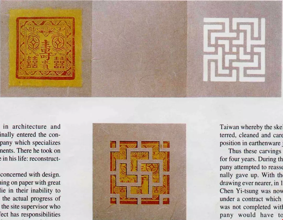 在他的圖案收集中,以窗櫺為主,有一千多種。傳統建築的窗櫺除了分割空間、柔化光線,構圖的變化及意涵更引人入勝。傳統圖案以諧音、象形及隱喻吉祥話來裝飾家屋,常見的有葫蘆、金錢、卍字、盤長紋,皆可以集合、分解、變形。每一個單元圖案不斷重複後,又出現另外的大圖案,單是象徵吉祥萬福、連綿不絕的卍字,在不同的集合排列下,可以組出六十種左右的「卍字錦」呢!
