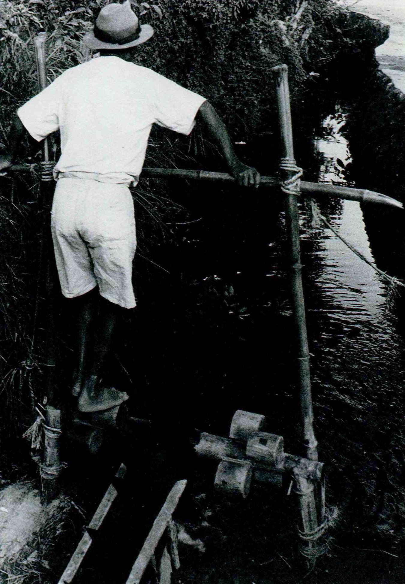 「踩水車」(一九五九年)使我們清楚見到昔日農村的勞動工具,在踩水車的農民配合下,如何運作的情形。俯攝的取景,含納了人與物的細節,老農夫屈曲的背影,和他似乎永無休止的踩步動作,表達了台灣農民性格中辛苦、勤勞與堅韌的一面。