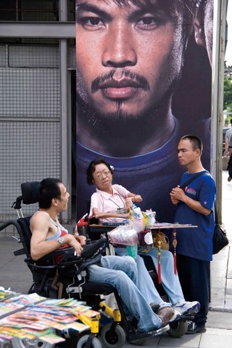 樂透人生? 文‧紀國章 圖‧紀國章 2008 8月 EN 分享: 生活,對某些人而言是享受,但對另些人來說卻是試煉。 人來人往的信義商圈裡,巨幅的肌肉型男看板前, 兩名肢障者面對乏人問津的樂透彩券, 也只能無可奈何地聊天打發時間。 分享: