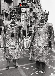 神明過馬路 文‧紀國章 圖‧紀國章 2004 9月 EN 分享: 媽祖駕前的首席護法「千里眼」(左)與「順風耳」(右),傳說能眼觀千里、耳聽八方,法術極為高強,但來到現實的人間十字路口,也得乖乖等紅燈,讓過往人們趁機瞻仰一下神明的威風。 媽祖駕前的首席護法「千里眼」(左)與「順風耳」(右),傳說能眼觀千里、耳聽八方,法術極為高強,但來到現實的人間十字路口,也得乖乖等紅燈,讓過往人們趁機瞻仰一下神明的威風。 分享: