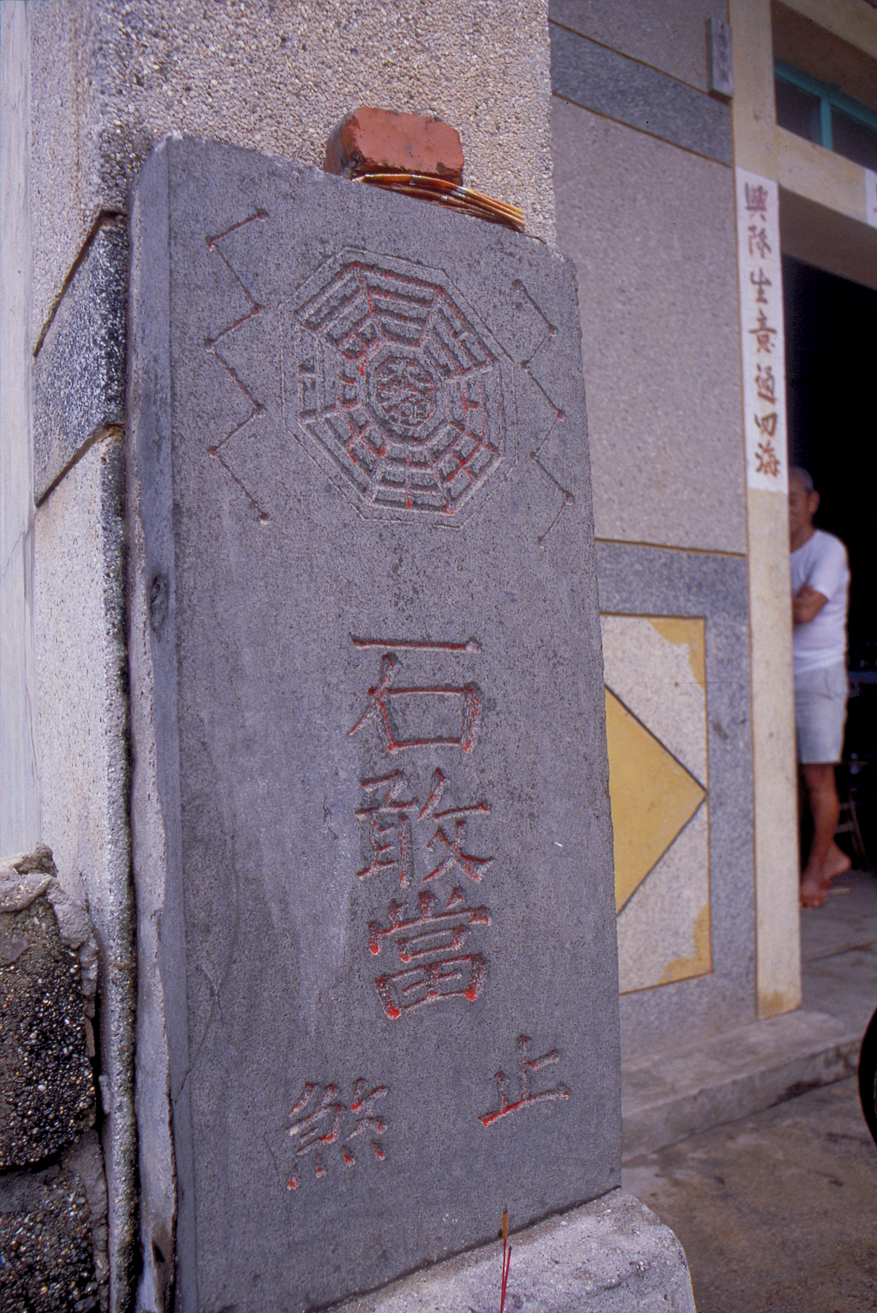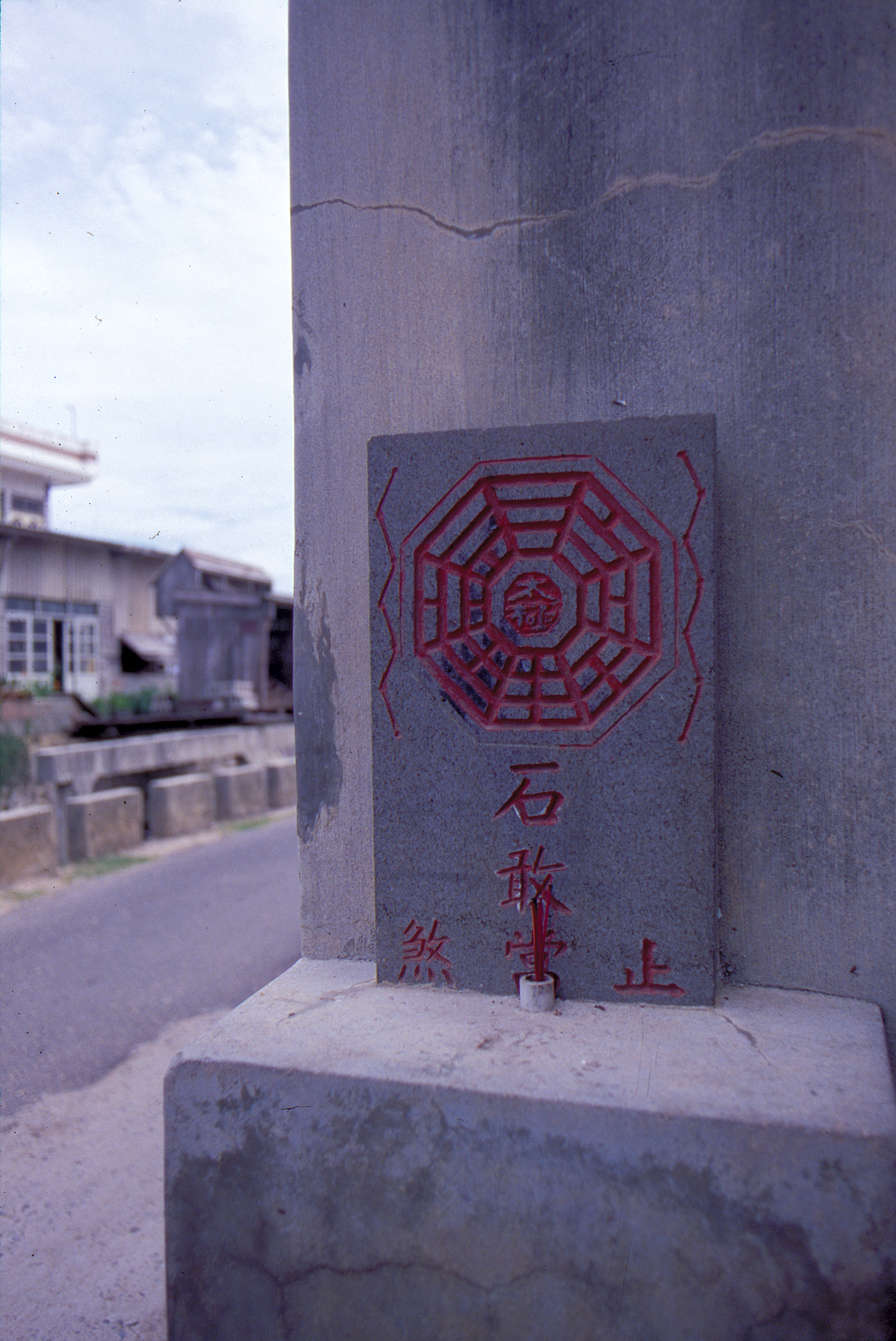這種石頭表面通常會刻上「石敢當」三字,它們密密麻麻的分佈在牆上、門邊和交通要衢,將每戶人家都保護的滴水不漏,形成全台灣最堅強的精神防禦系統,而它們所防範的就是吾輩等×。曾有同事沒踩探清楚,而鼻青臉腫的回來。