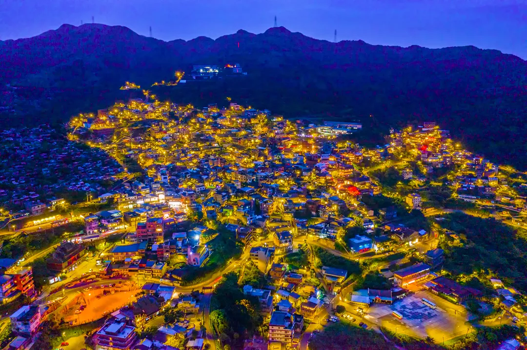 九份的夜晚令人著迷,金黃色的燈光照亮整個山頭。