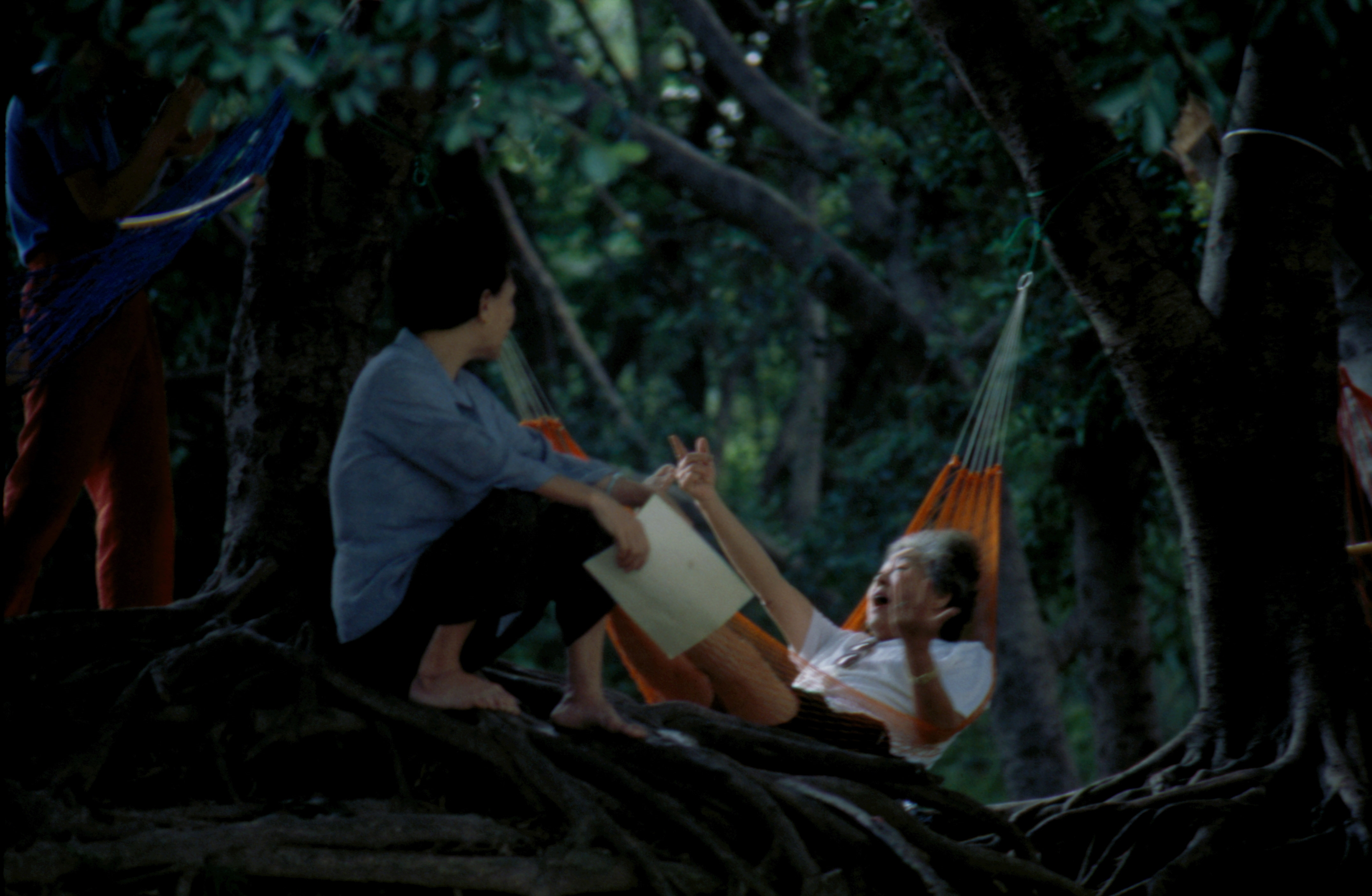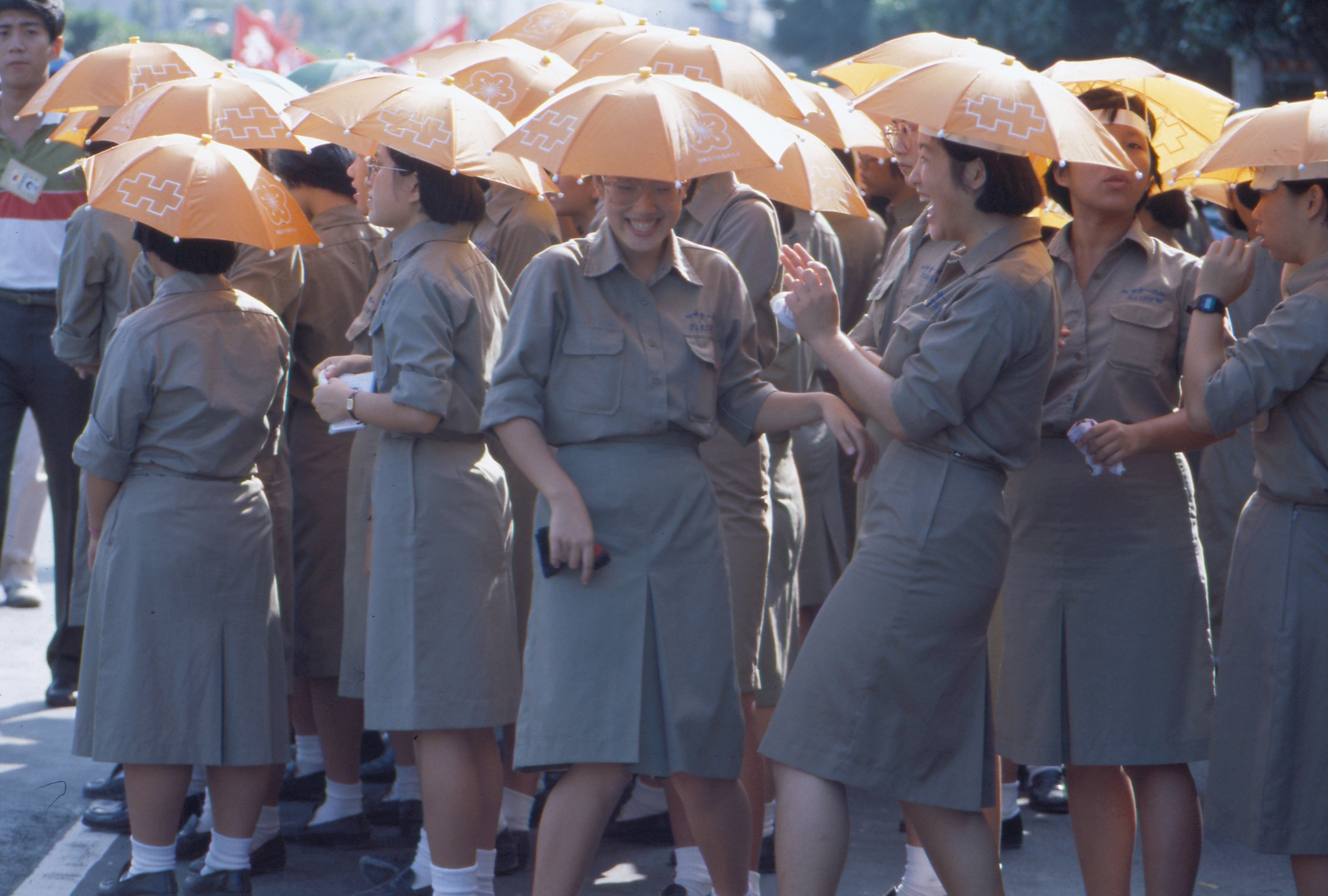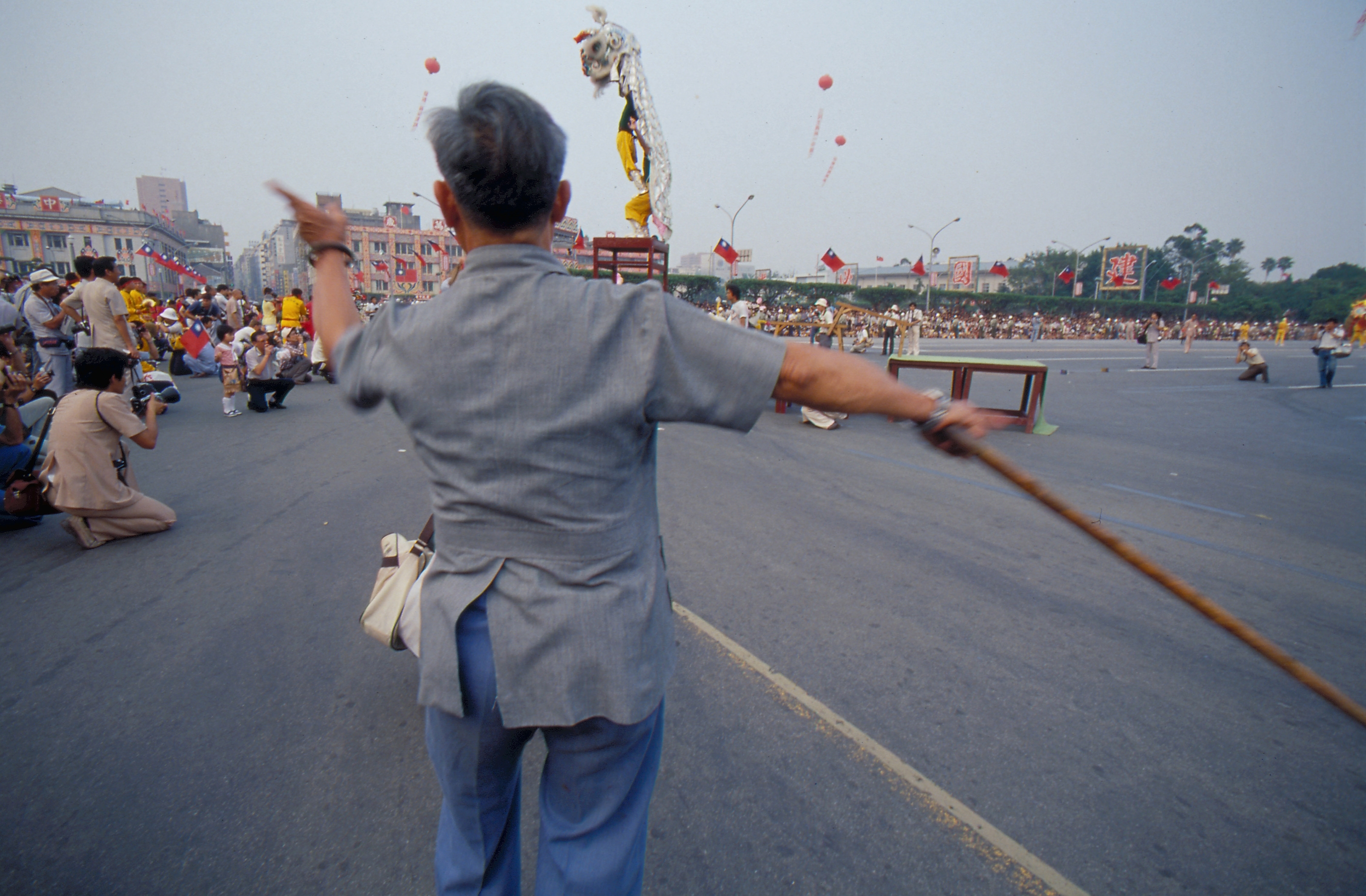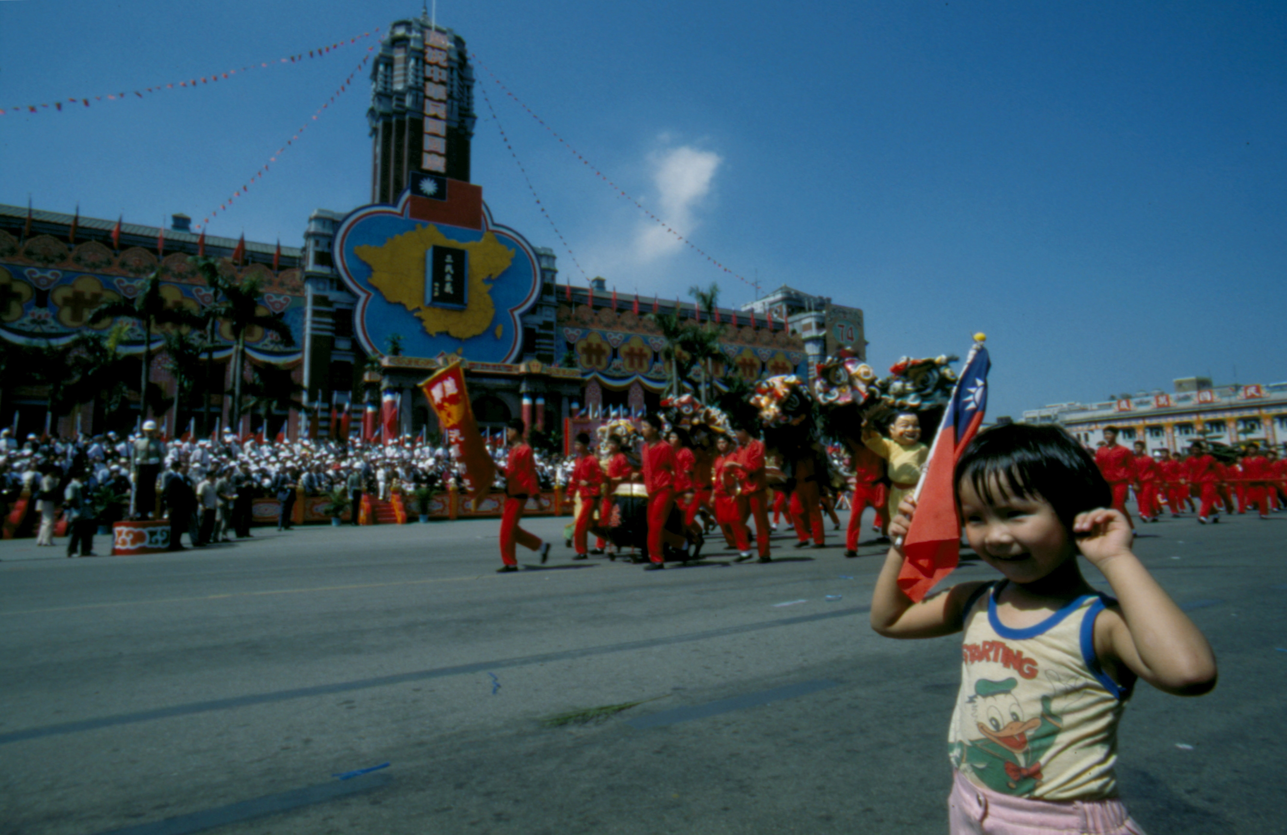 書本上說,他們帶來了「亞洲第一個民主共和國」;七十四年後的這一天,攝影師的鏡頭卻作了無心的註腳:人潮裏用手捂住耳朵的小女孩、隊伍中踏著大步的阿兵哥,還有賣力指揮獅隊的老行家、黃澄澄傘帽底下笑顏如花的女學生、以及公園吊床上的祖母級遙想當年舊夢,和燈火輝煌下,淡水河水閘外看煙火的全家人緊緊牽執的手……。