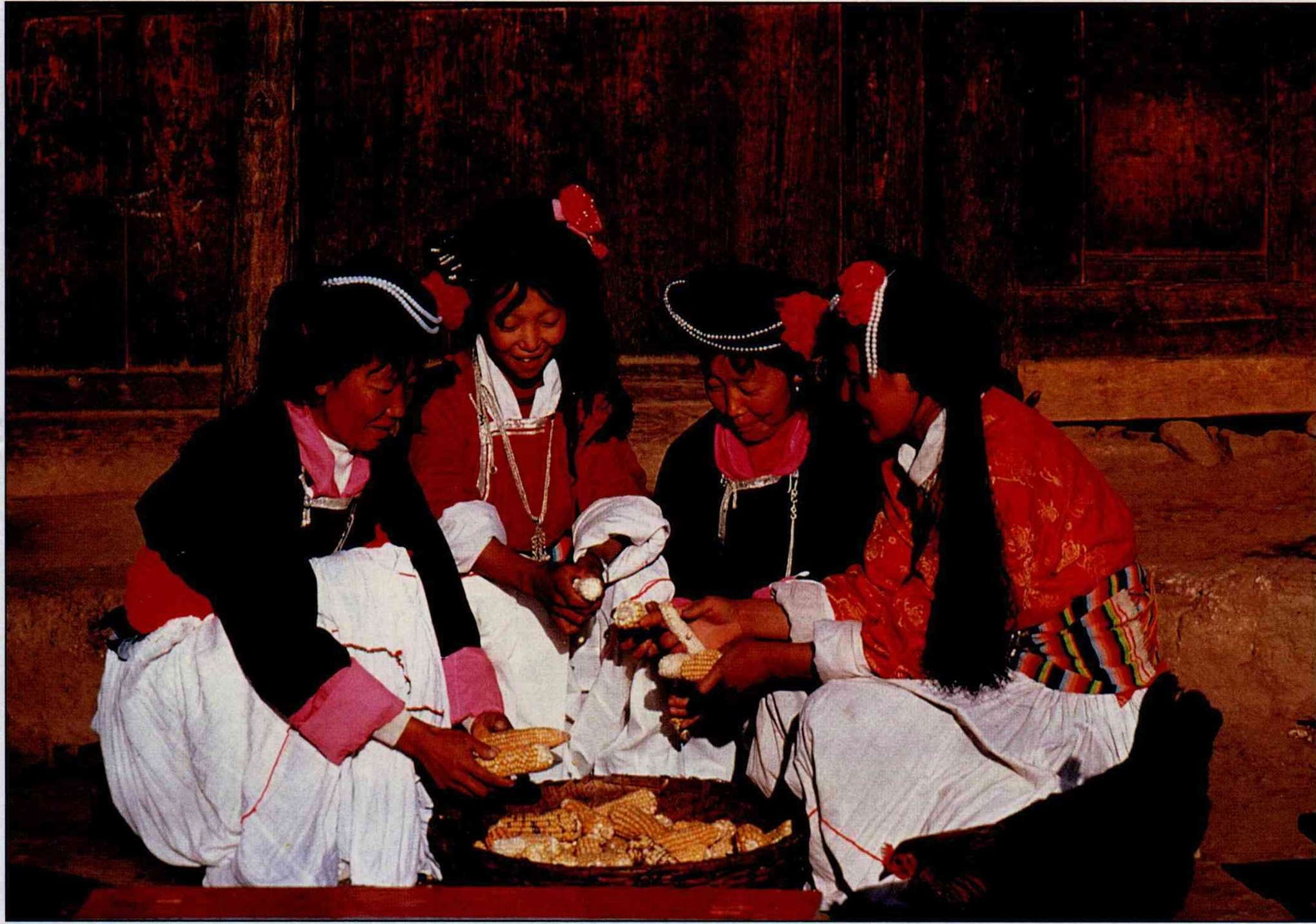 瀘沽湖畔的摩梭姊妹忙著家務。
