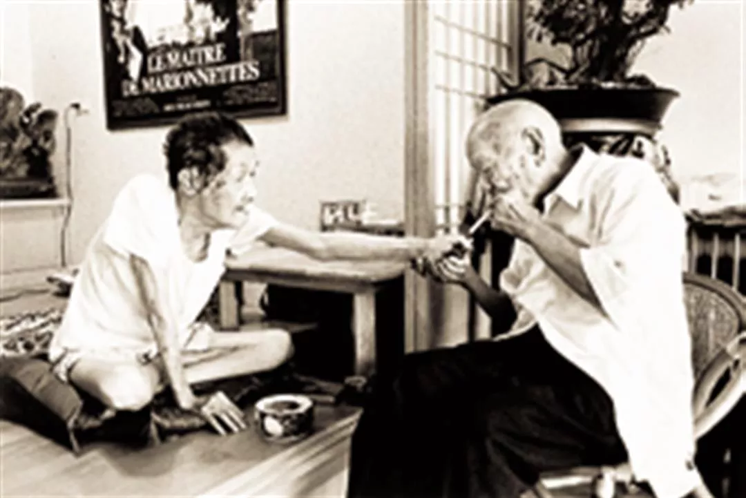 在李天祿(左)的三芝新家中,兩位台灣布袋戲大師對坐暢談,惺惺相惜。