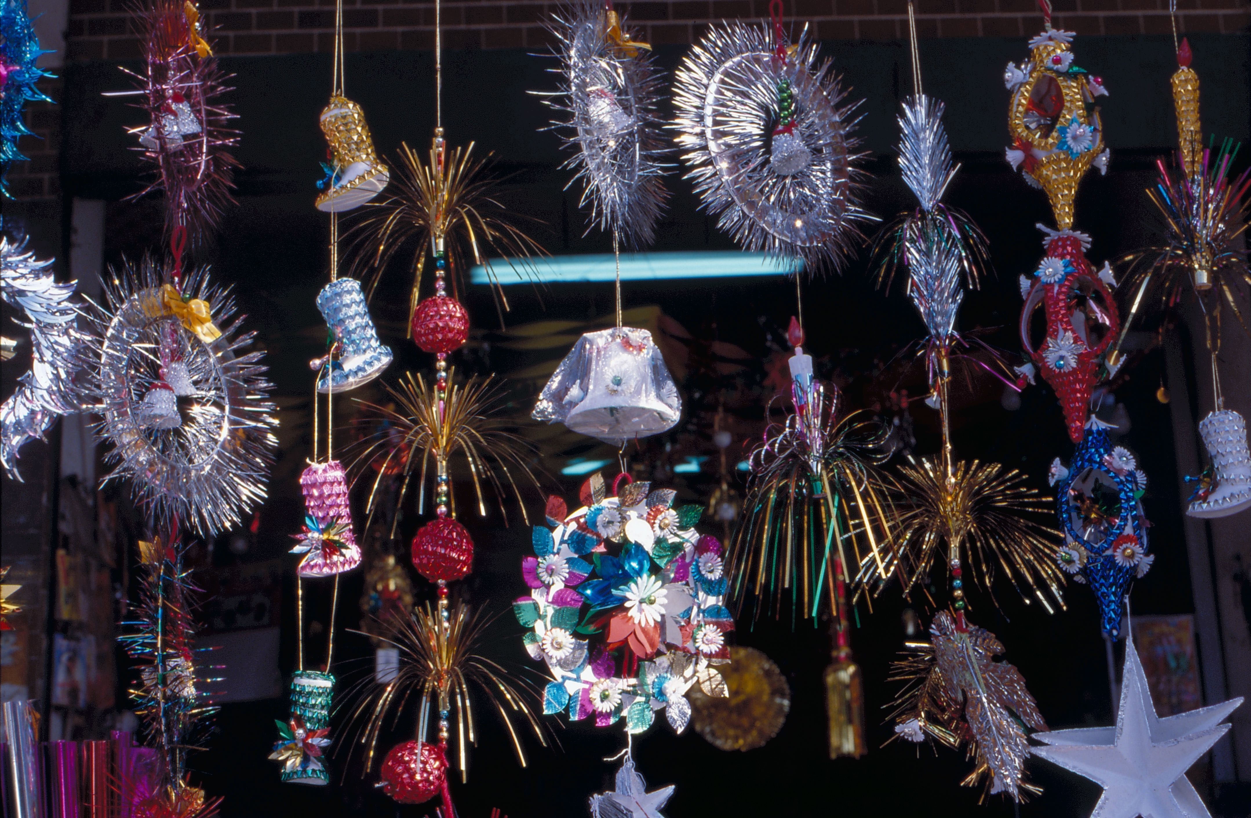 出售各種耶誕飾物的商店生意很興旺,許多文具店把各種五彩繽紛的紙飾懸掛在店口,在陽光映照下顯得耀眼無比。