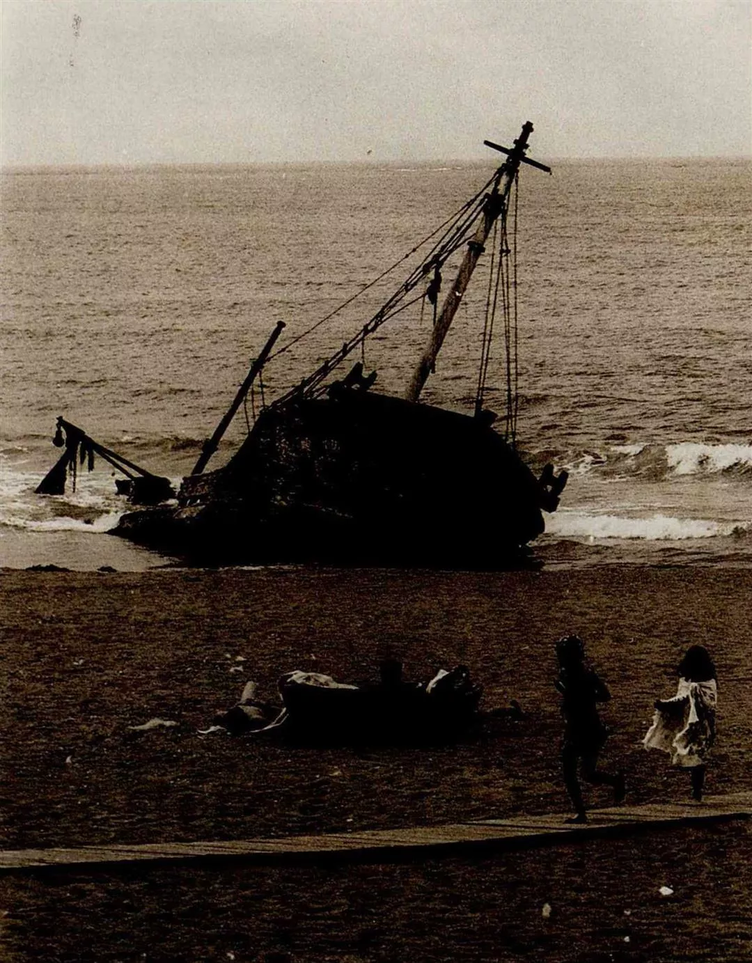 在「海水浴場」(一九七○年)這張照片裡,我們看到一艘觸礁損毀的大船沈埋在沙灘中,兩個小女孩在前景急跑著,而面對著傾斜的破船,有泳者仰天而睡,構成一幅頗為荒誕、諷刺的景觀。那橫斷水平線的桅竿與沙板道上奔跑的足跡,在陰灰的天色下,簡潔有力地表達了一種災難的不安,而靜臥其間的人體,似乎遺世獨立般地,享受自己片刻的鬆弛安祥。這超現實的氛圍,很容易讓人引發出文明荒廢的世紀末聯想。