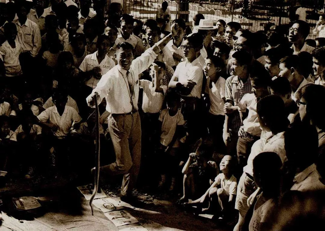 「賣藥郎」(一九六八年)一圖中,作者在取景的視角,光影的運用,瞬間的把握上,確有獨到的經驗與眼光。我們的視點可以由賣藥郎的表情、姿態、地上的圖表、手中的玩物,一直遊走到四周觀眾每一個顏臉上,勾起我們無盡的興致與回憶。