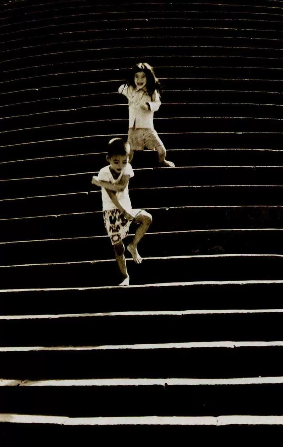 「貓」(一九七○年)、「石級」(一九七一年)顯示了陳彥堂的童心以及他對幾何構圖的用心。仰攝中的貓坐在門檻上,它的視線與門柵內母子兩人的焦點互異,產生一組有趣的視線推延。而跳躍在石級上的頑童,略為失焦的顏容與手示,則加強了那種活潑動感的生命力,光影的逆差變化,使畫面更具新鮮的立體感,人物得以突顯出來。
