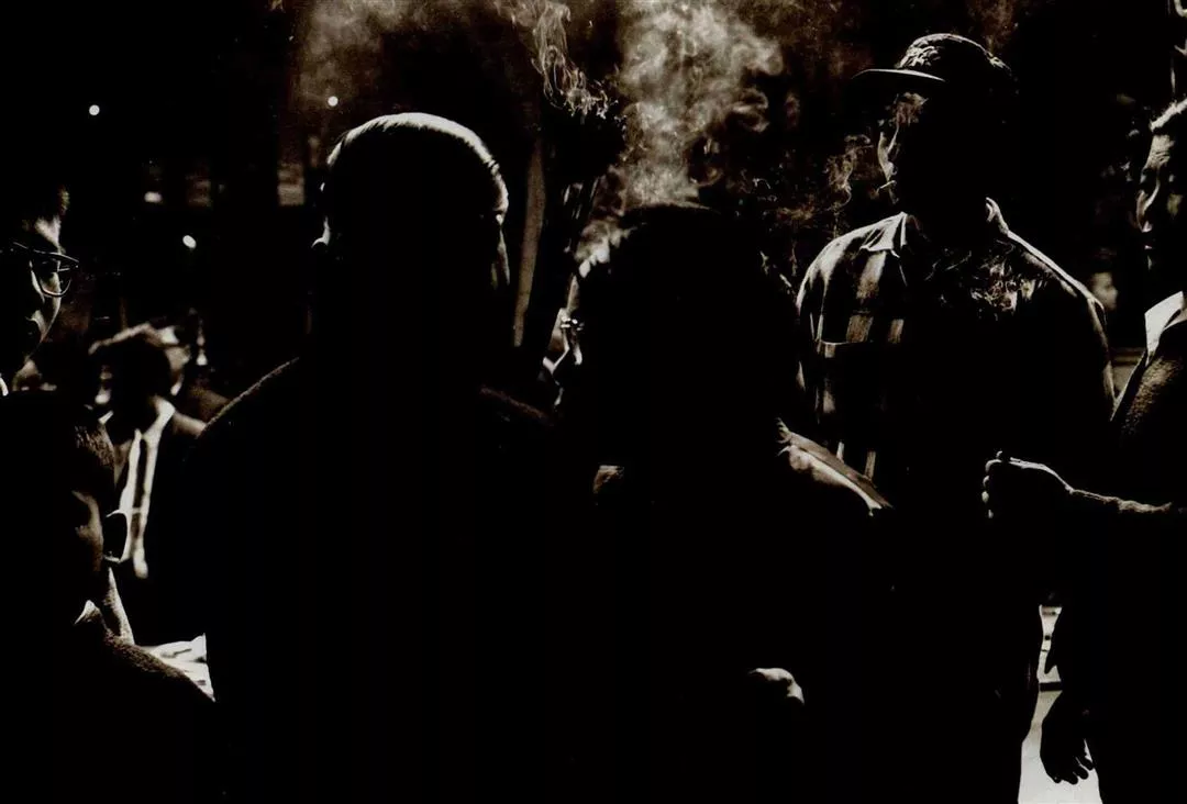 光影的巧妙運用,我們同樣地可以在「煙塵」(一九六八年)中看到。畫面中的六個人物以不同的身姿均勻散佈,頂光微微地照射在他們的側臉與輪廓上,顯現出一份低調迷離的氛圍。視線如果沿著他們身上的光源移動,可以連接成一筆有機的線條,最後再與空中的渺渺煙塵會合,由他們沉鬱、疏離的臉色中,去體會一幅「無聲勝有聲」的內心世界。