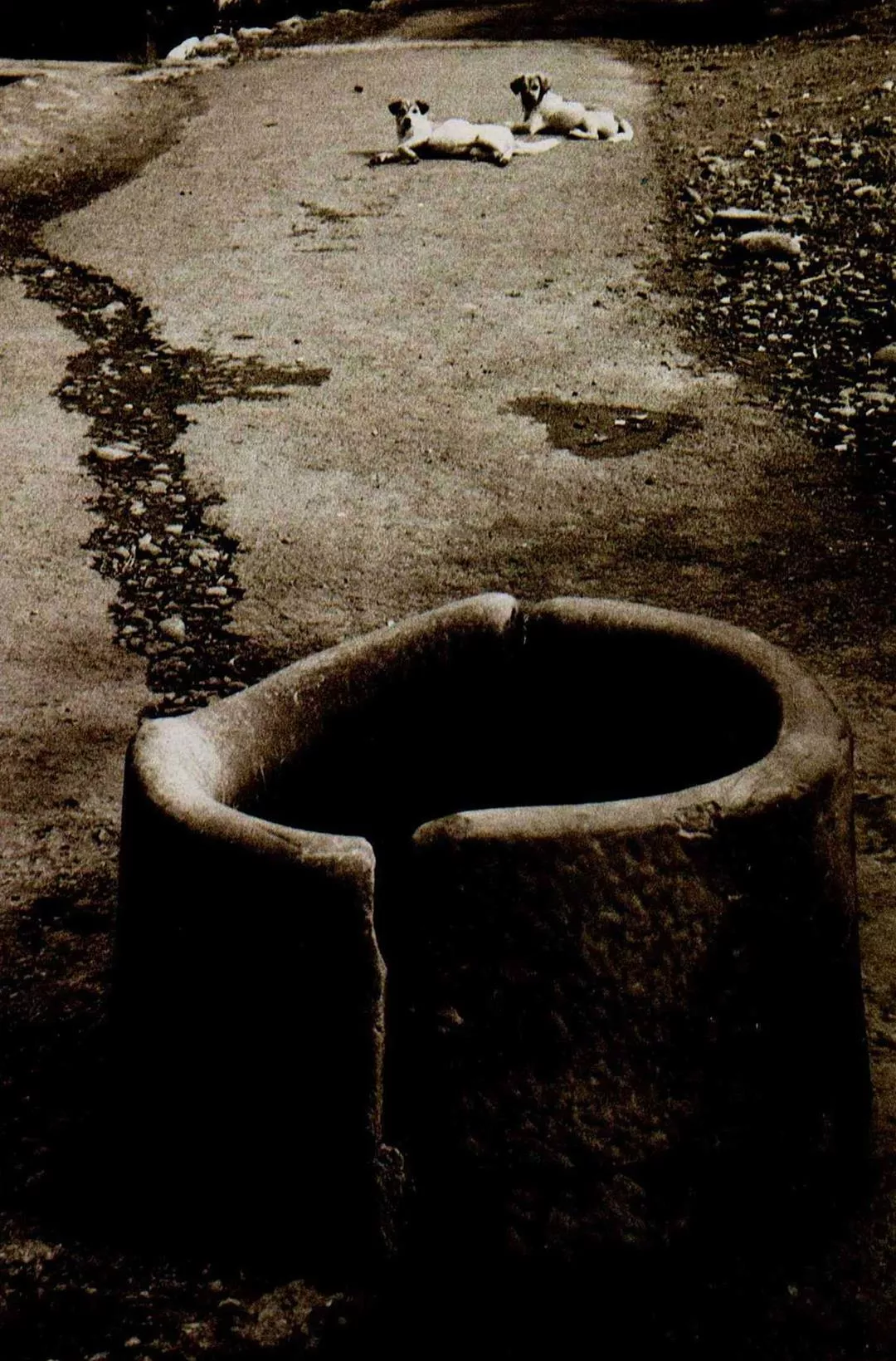 「古井」(一九六八年)作品中,他以一口造型奇異的老井做為前主體,遠方有兩隻體態相似的野犬眺望偵伺著。井沿邊的裂縫與地面的龜痕,擬造了一種詭魅的氣氛,久久瞪之,雙犬所偵伺的焦點,似乎更指向漆黑的井洞,好像在那不明就理的黑暗中,隨時可能出現另一種精靈幻象。
