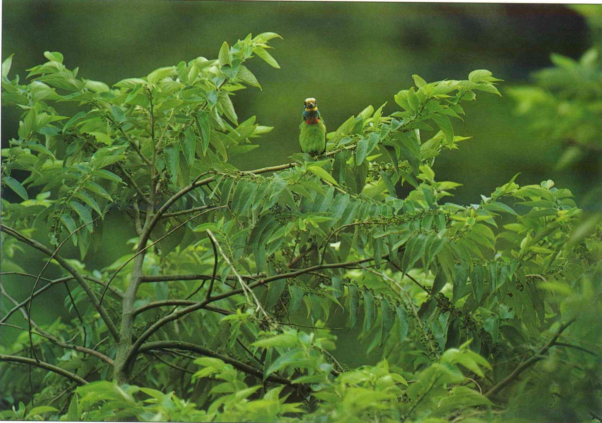 一身鮮綠羽毛的五色鳥,停在茂盛的綠色植物裡,具有很好的保護效果。五色鳥。