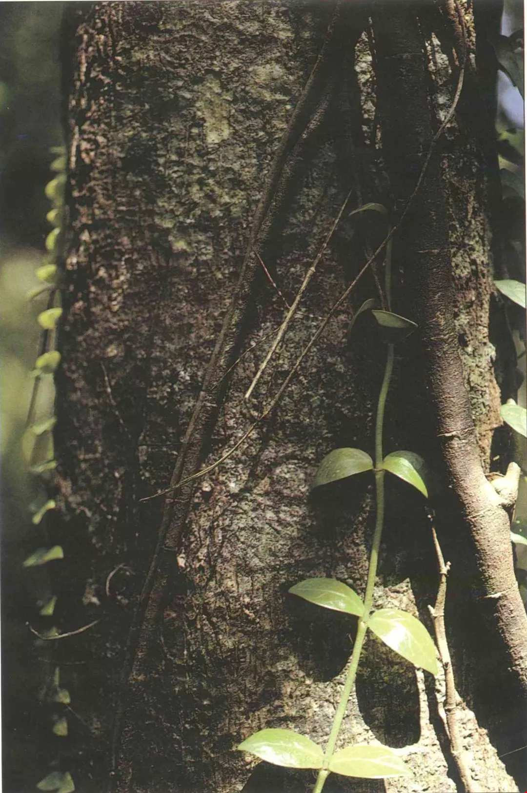 身軀細長加上枯黃的體色,棲息在樹幹上的竹節蟲猶如附著在樹幹上的枯枝一般,不仔細看還真發覺不到。竹節蟲。