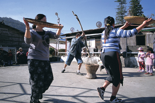 遷村 文‧李國盛 圖‧楊文卿 2006 2月 EN 分享: 南投縣•仁愛鄉•瑞岩部落 舂小米的杵高舉重捶,節奏規律而深沈;源自泰雅族織布機零件的「裂痕鼓」,則發出清脆響亮的聲音。生活器具拿來當作樂器,再配上從長輩口中流傳下來的織布歌,就足夠群山環繞的瑞岩部落一個早上的歡樂舞蹈。 傳統上,泰雅族結婚沒有正式儀式,只有族人聚在一起歡樂見證。遷村動土大典的這個早晨,他們擷取「泰雅女子成長祭」中關於婚娶的一段,帶著滿懷期待排練著,準備在大典上酬迎祖靈,引領著世代看顧他們的祖先們,一起到新部落安居。 分享: