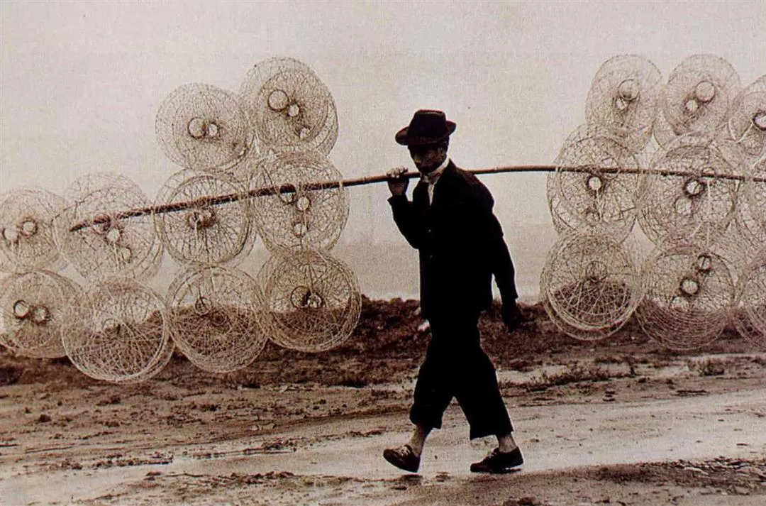 拿著竹竿、扛著耕具的出勤農夫,扛著燈籠、穿著有趣的趕路男人,張牙怒目、銅膚亂發的雅美土著,左躺右臥、姿態詼諧的午覺男人……謝震隆抓住了這些人物的造型趣味,在他們若靜若動的舉止中,傳達了影像的「韻律感」。那農夫與牛的行姿與連接二者的繩線、那直的竹竿與圓的燈籠、趕路人略為前傾的身姿、那雅美族人重疊的肌膚光澤與視線互異的面容、那兩個午睡男人手足構成的有機曲線……那麼和諧地相對平衡著,雖然他們的動作被相機的快門擬定成靜止,但我們的視線將因畫面構成的韻律感,仍能領會那一瞬間之中「靜中有動、動中有靜」的前後連續時空。