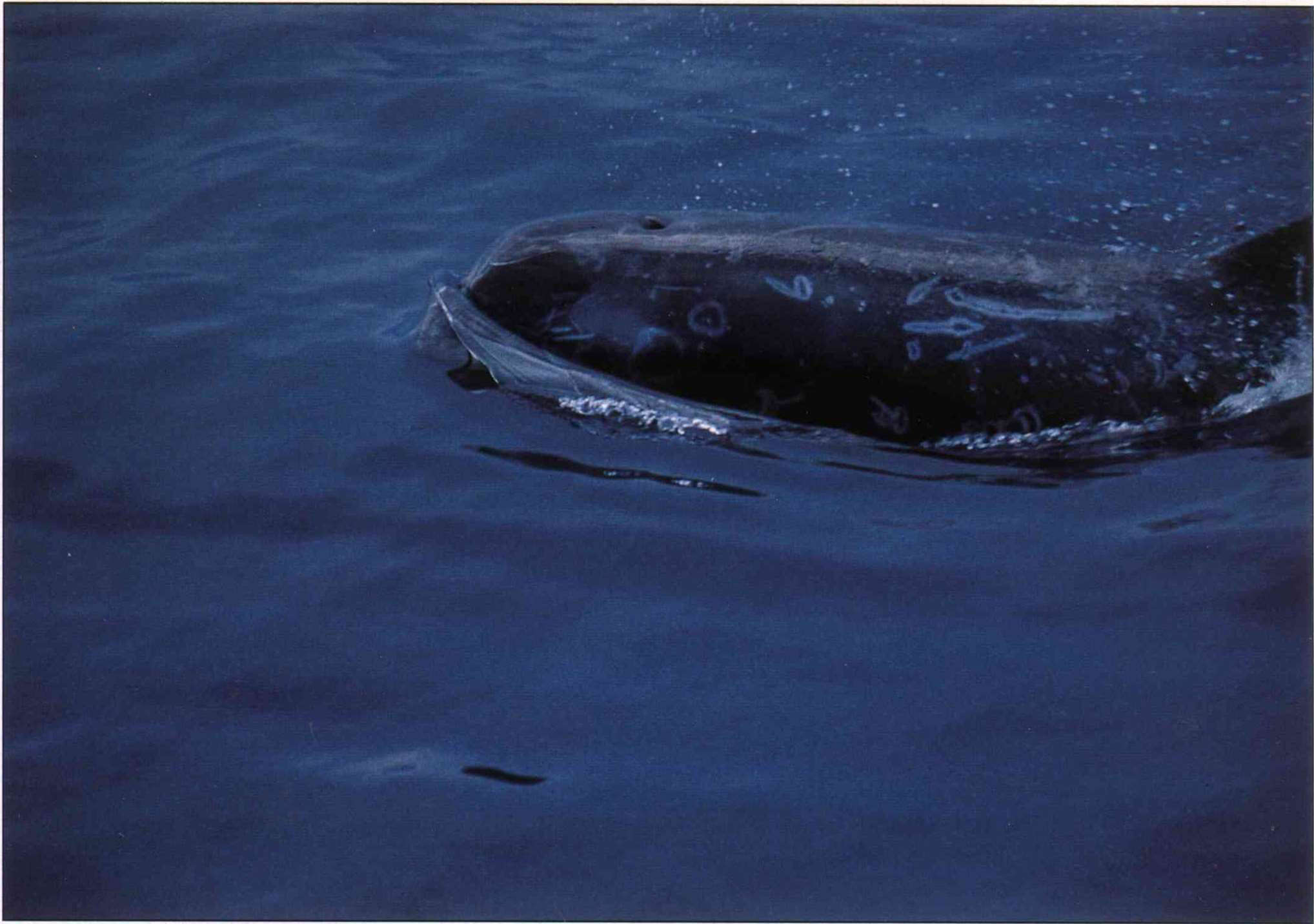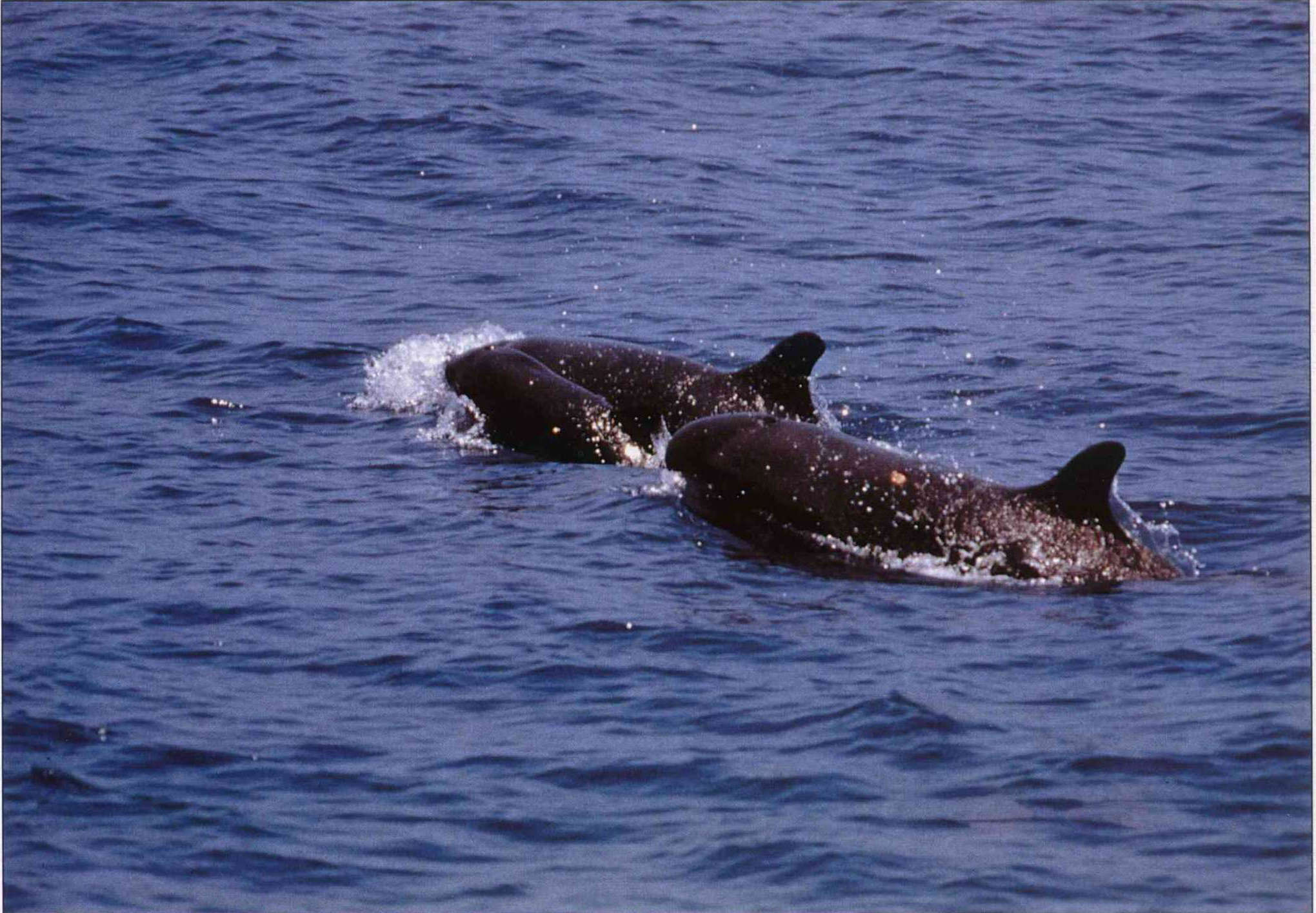 花紋海豚 體粗壯、頭鈍,吻不明顯,俗稱「和尚頭」,身上之淺色似刮痕般之紋採可資判別年齡,愈老愈顯灰白。 楊世主攝。