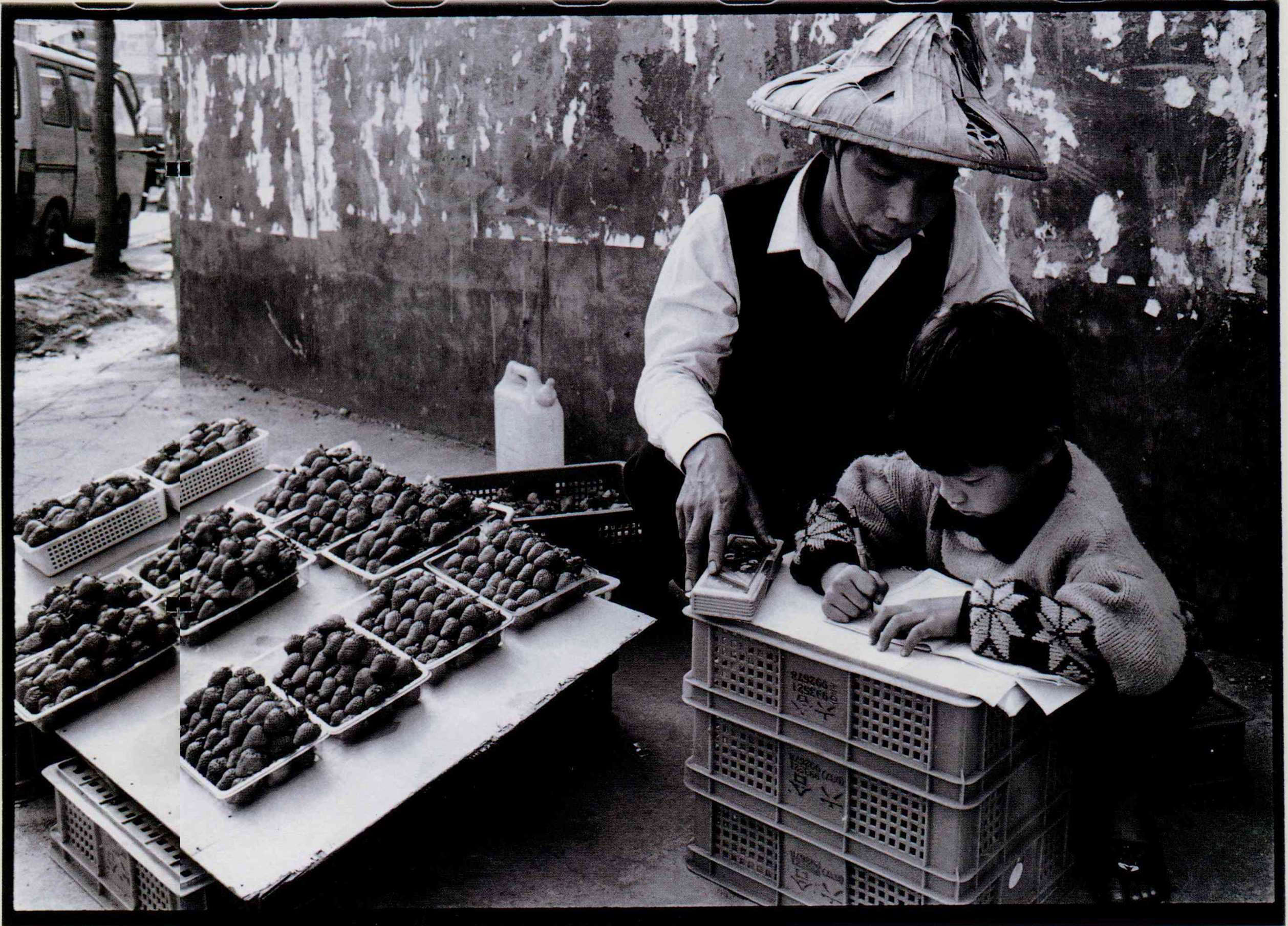 (右)放寒假了,家長不知如何安排小孩子生活,只好帶他出來做生意,並就地指導小孩子寫功課。