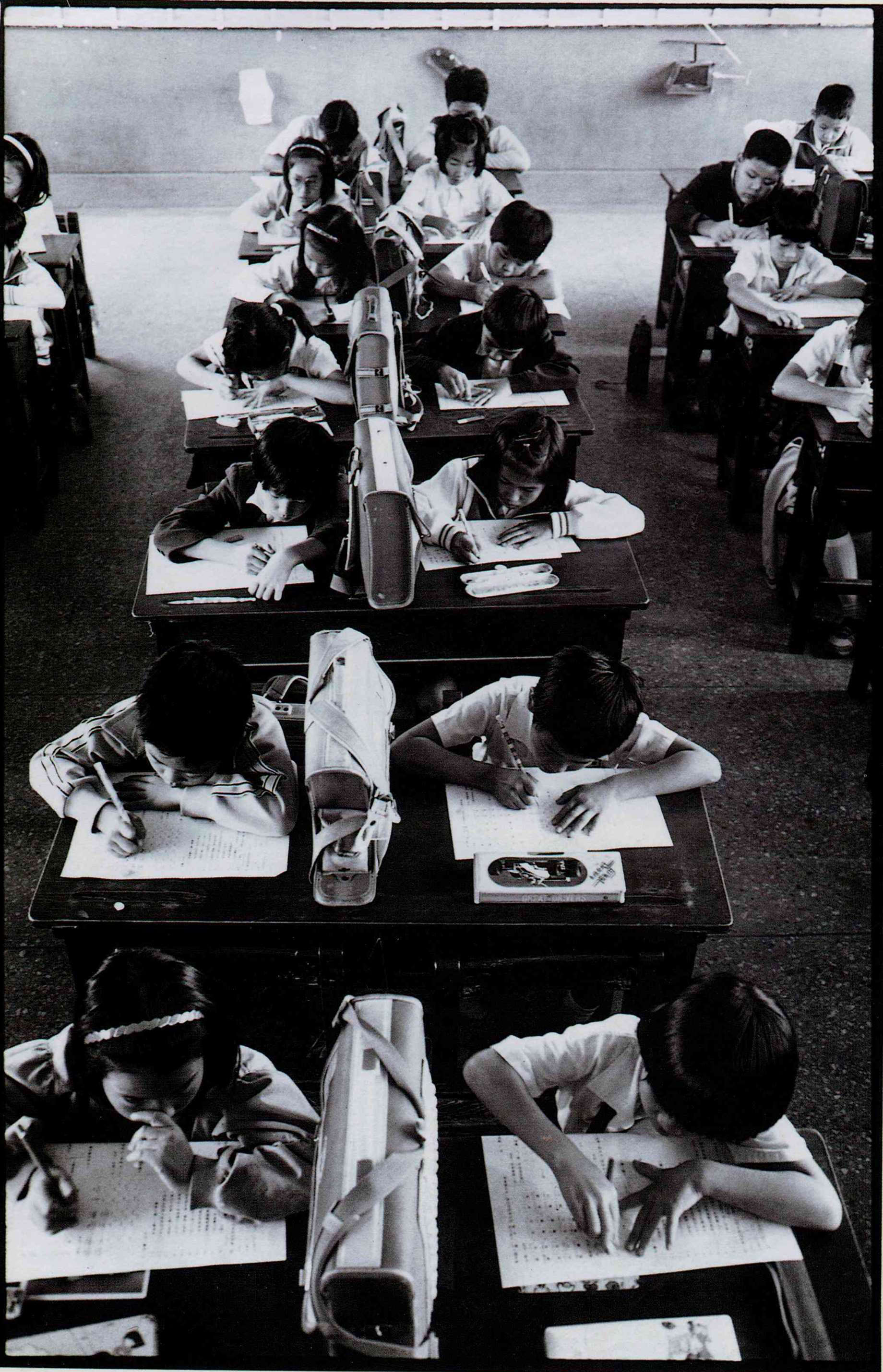 (左)考試時,學生自動把書包放在書桌中央,以防隔牆有「眼」。
