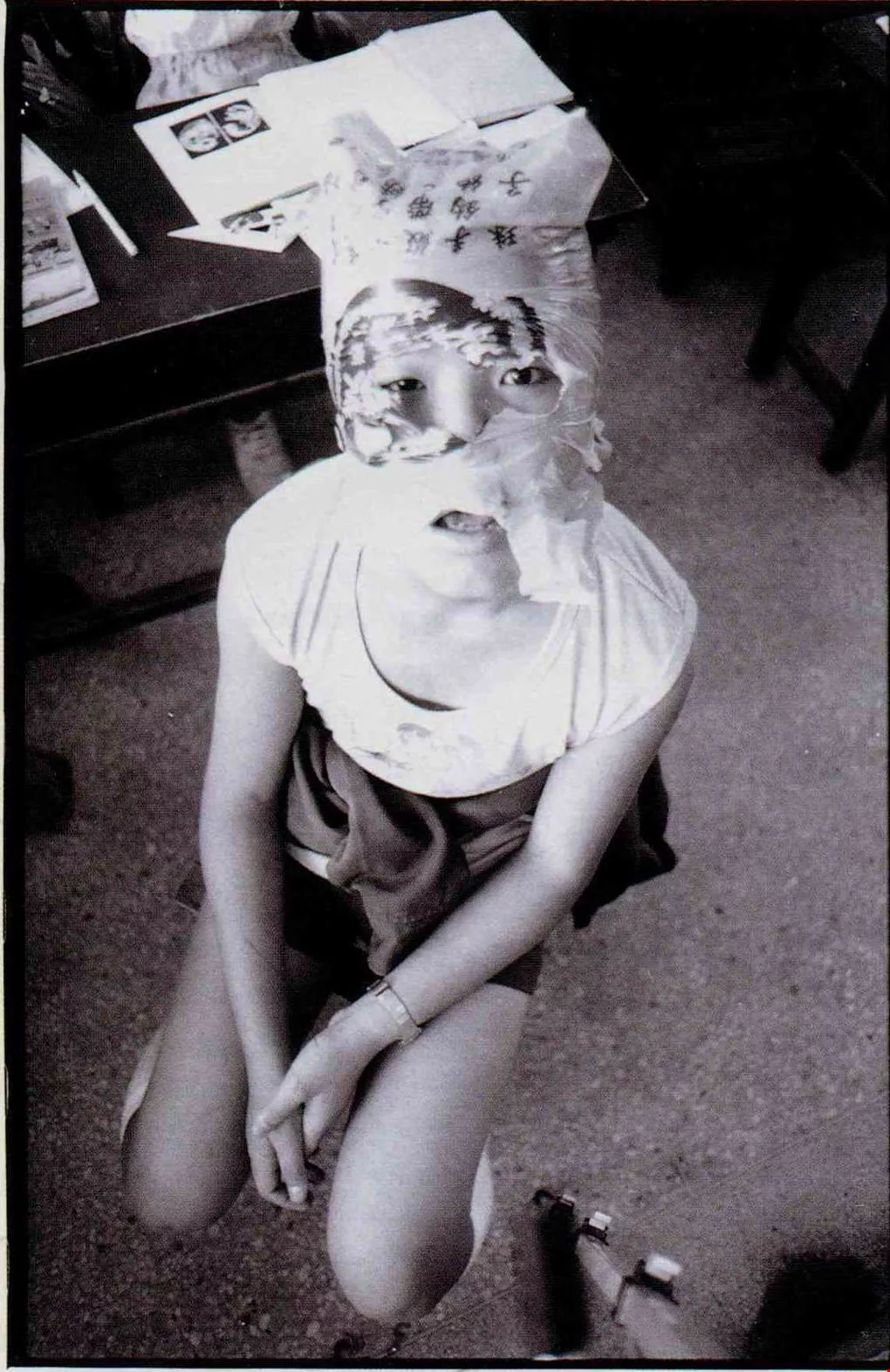 (右)大華是六年級學生,因長期注意力無法集中,以致功課落後。下課時,他將塑膠袋套在頭上,想引起同學及老師的注意。