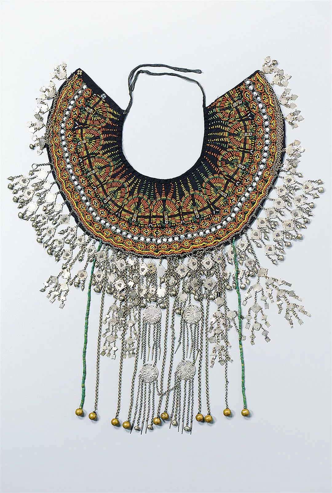從異質文化中尋找新穎的藝術基因,陳正雄的作品融合其收藏清宮廷服飾的柔美和原住民文化用色的豐富,自成一家。(圖為排灣族珠繡雲肩)