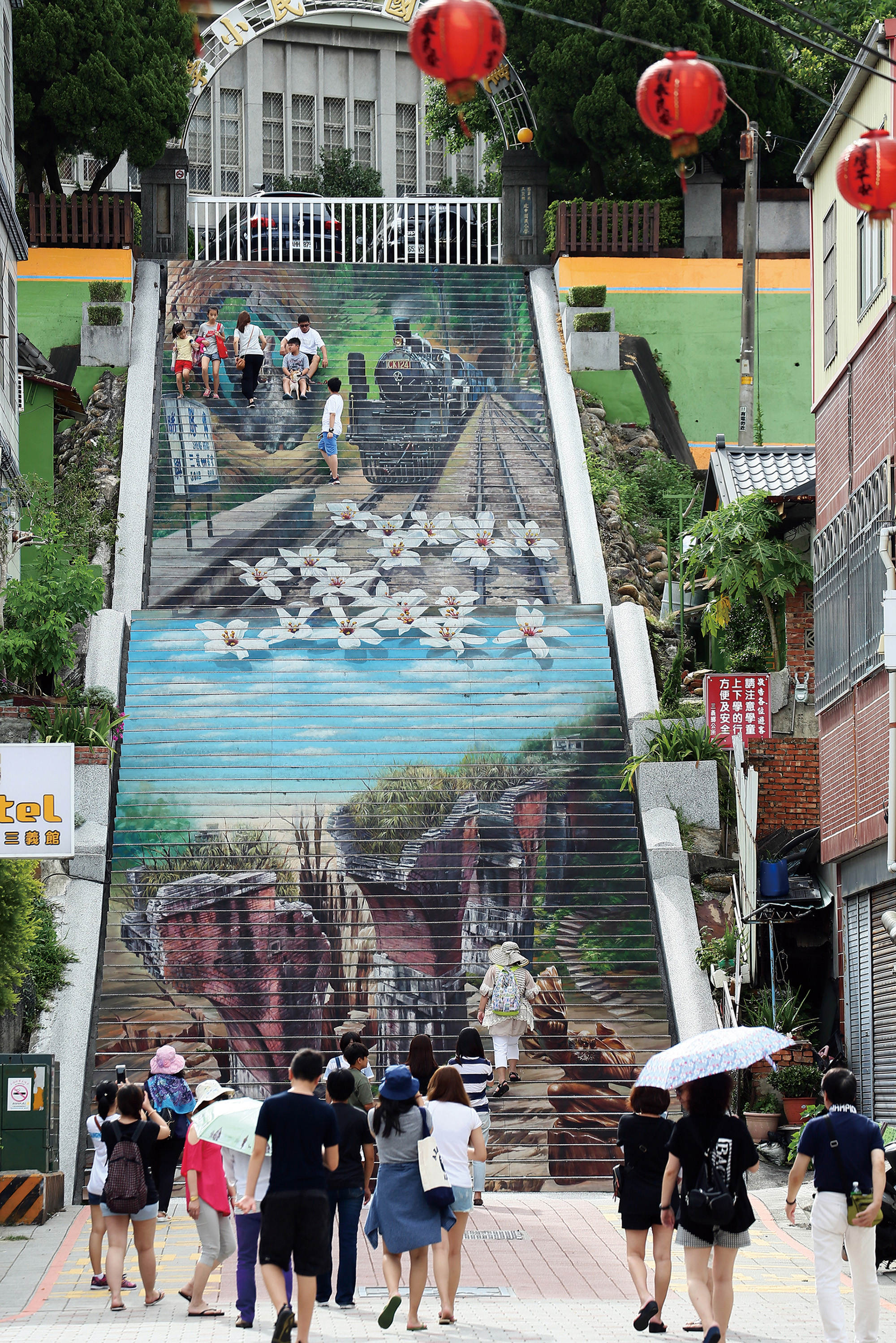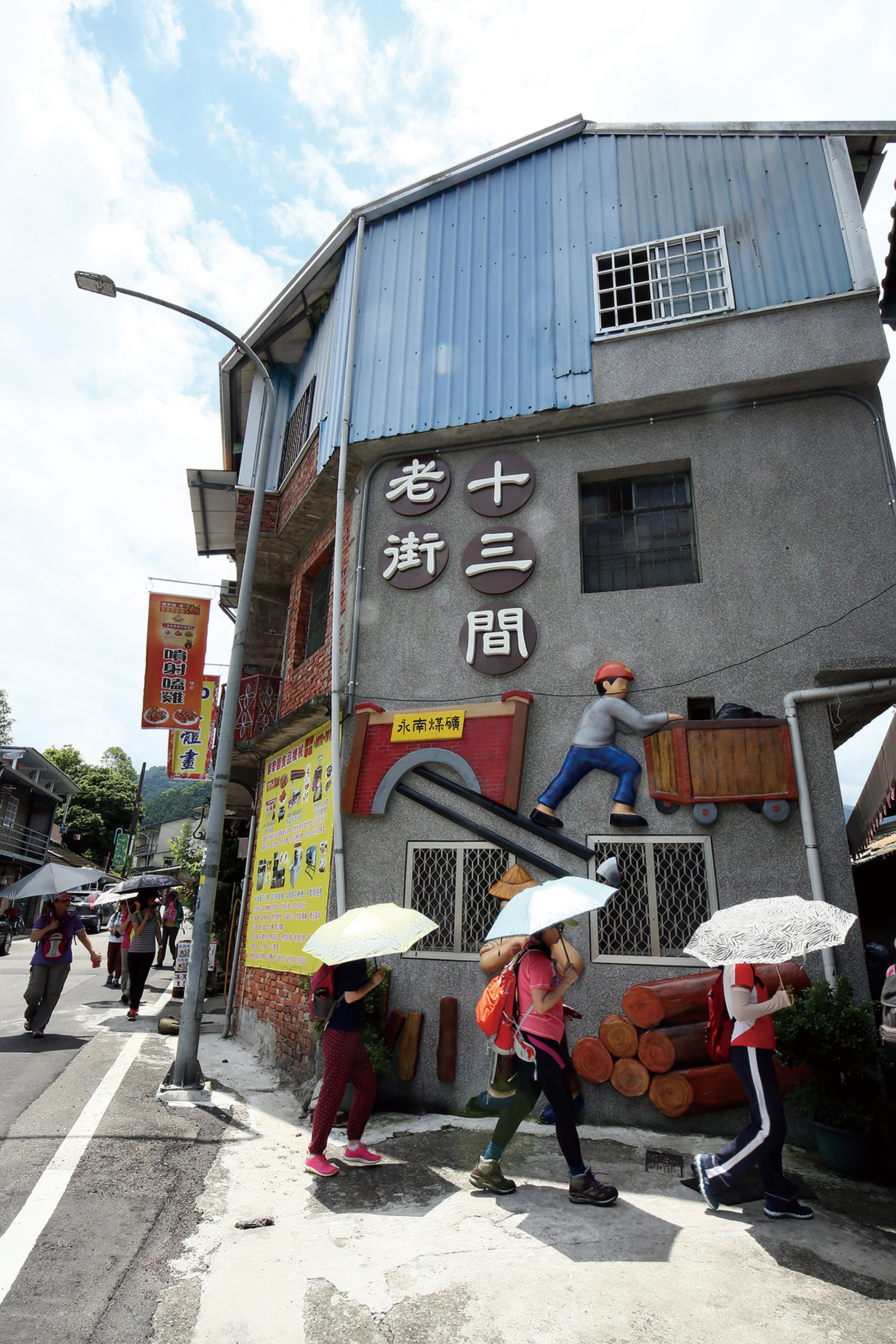 不同於桂花巷的蜿蜒小徑,寬敞的十三間老街店家密度不高,遊客較少,十分適合閒散漫步。走在十三間老街,會發現有些門牌造型不太一樣,木製的門牌上除了標示街道號碼,還畫有叉子、蛋糕、剪刀等圖案,代表這屋子在過去繁華時做的第一個生意。叉子加提袋代表雜貨店,八卦是命相館,剪刀梳子象徵理髮廳,蛋糕表示麵包店等,每塊門牌都各有玄機,讓人邊走邊發現,充滿樂趣。