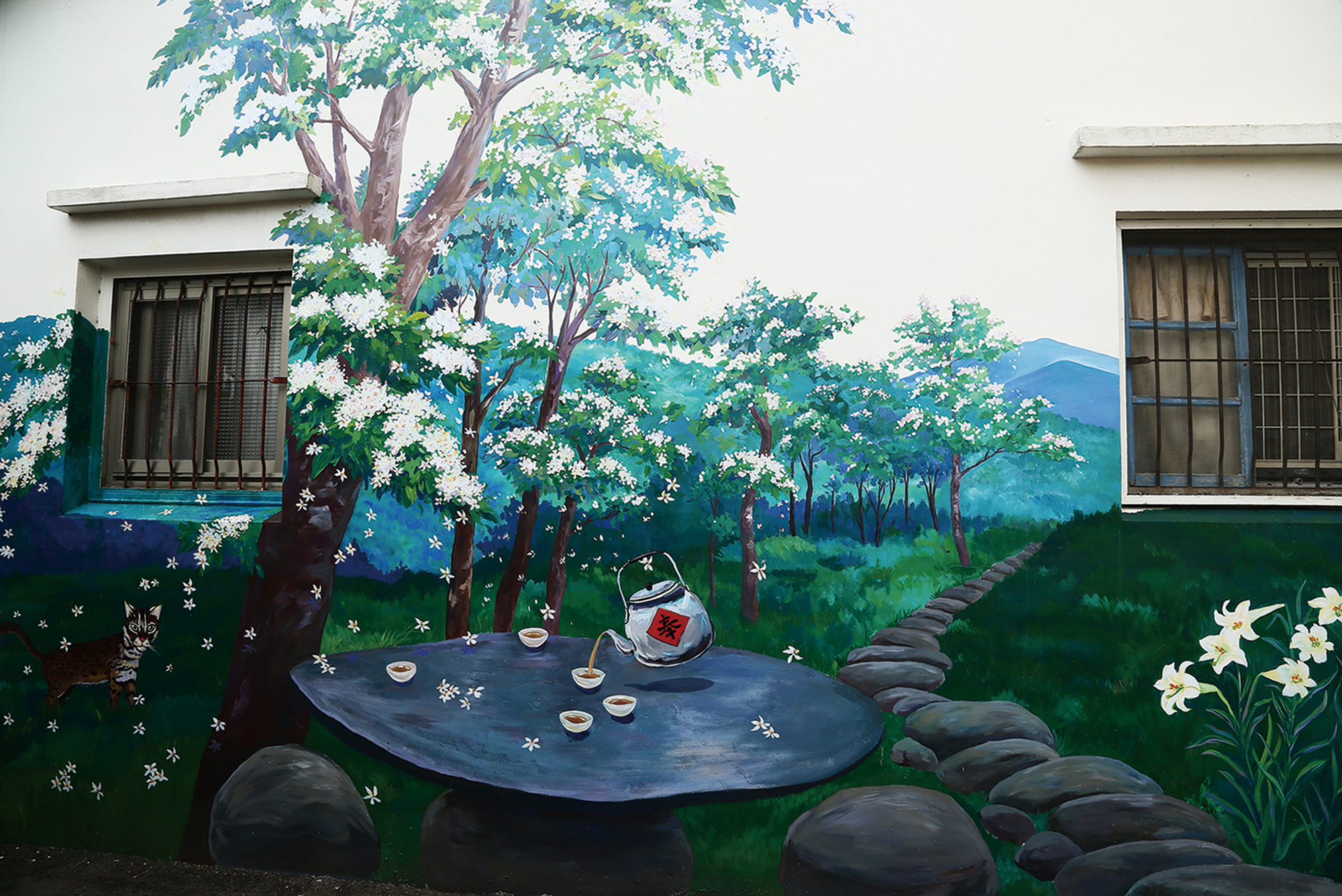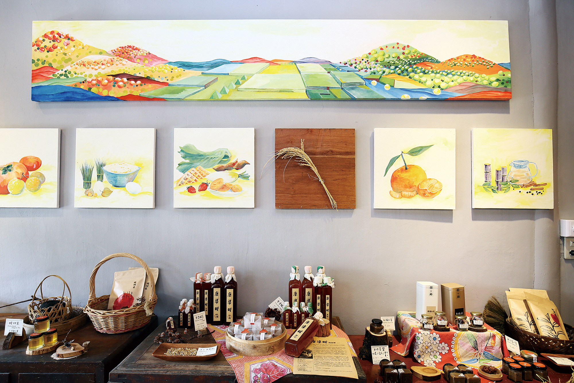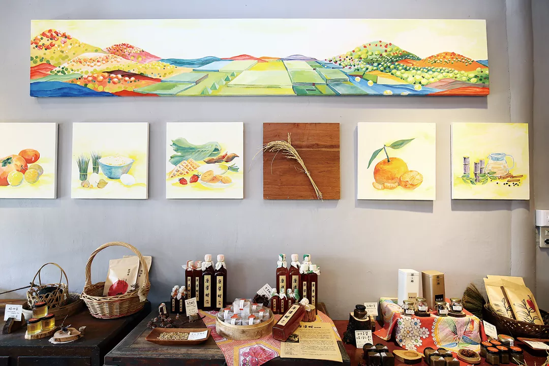 台三線上漸層耕作柑橘、 茶葉、水稻,組成帶有客 家傳統的景色,Valai農創 店為在地物產搭建舞台, 期望找回如牆上彩繪的美麗地景。