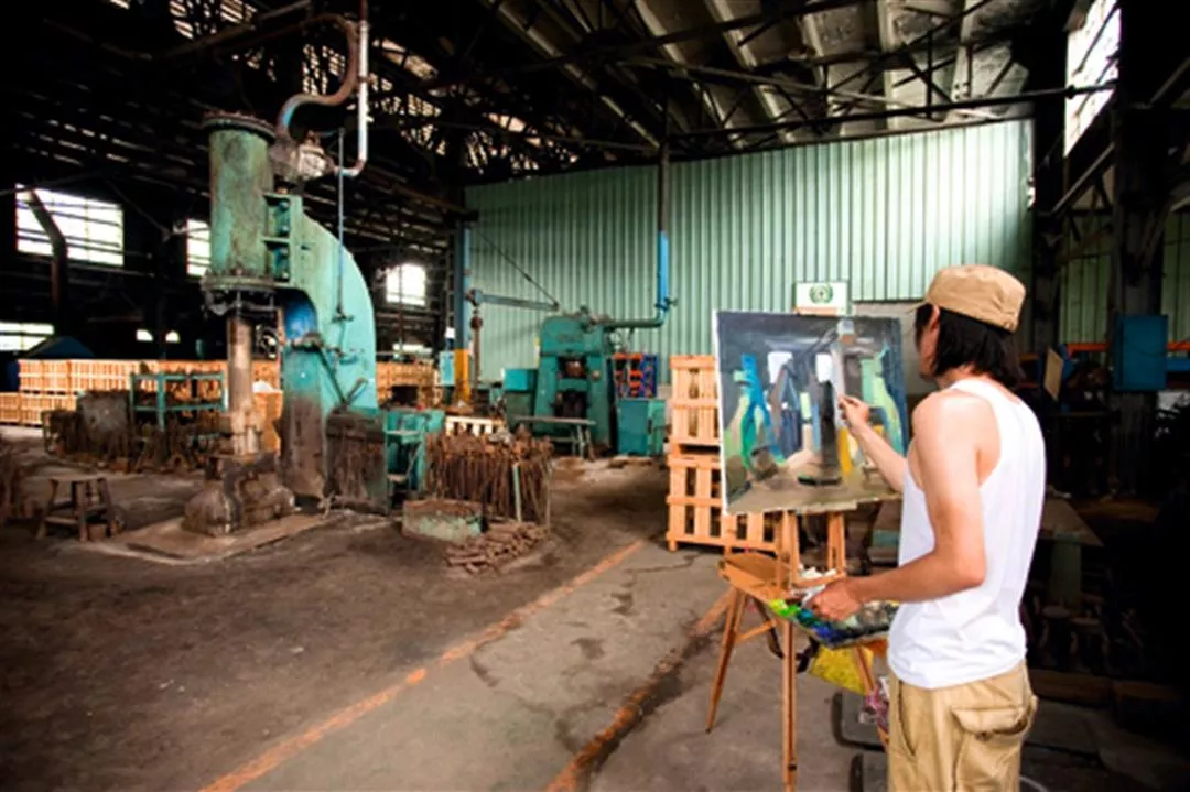 北廠難得開放參觀,一位民眾速筆作畫,為鍛冶工場內的蒸汽錘,記下最後的容顏。