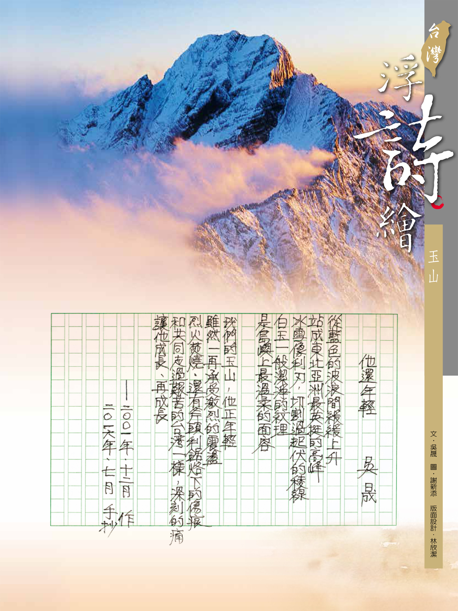 他還年輕 文‧吳晟 2016 8月 分享: 從藍色的波浪間緩緩上升 站成東北亞洲最英挺的高峰 冰雪像利刃,切割過起伏的稜線 白玉一般潔淨的紋理 是島嶼上最溫柔的面容 我們的玉山,他正年輕 雖然一再承受激烈的震盪 烈火焚燒、還有斧頭利鋸烙下的傷痕 和共同走過艱苦的台灣一樣,深刻的痛 讓他成長、再成長 ──二○○一年、十二月 作 二○一六年、七月 手抄 語文 台灣 本土 文學 專欄 分享:
