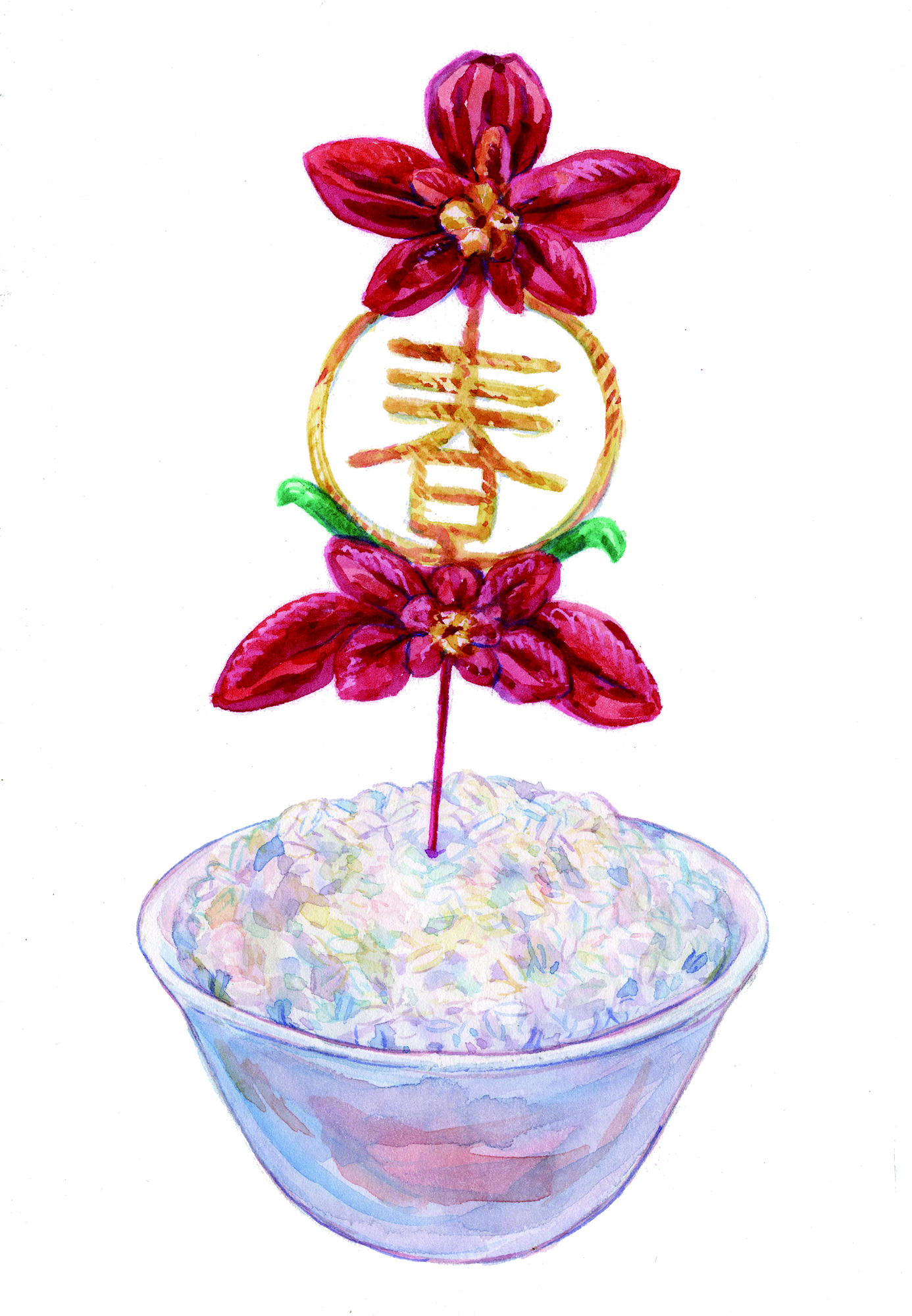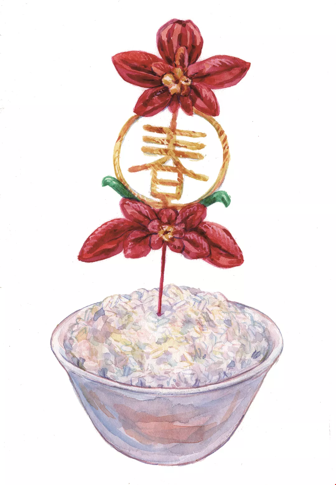 春飯:白米飯在碗裡盛滿堆高,插上以紙或布剪成的「春仔花」,稱之「春飯」,放在神桌上。台語的「春」與「賰」(tshun,剩餘之意)同音,「賰飯」就是剩飯,象徵米飯有餘。