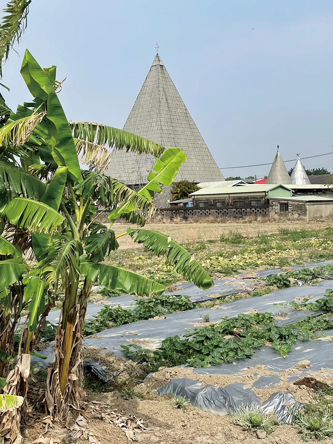 在台南鄉下地區的田野間旅行,地平線上赫然出現金字塔狀的尖塔,有如某種紀念性的建築,塔頂上矗立著十字架,原來是一座奇特的天主教堂/菁寮聖十字架天主堂。