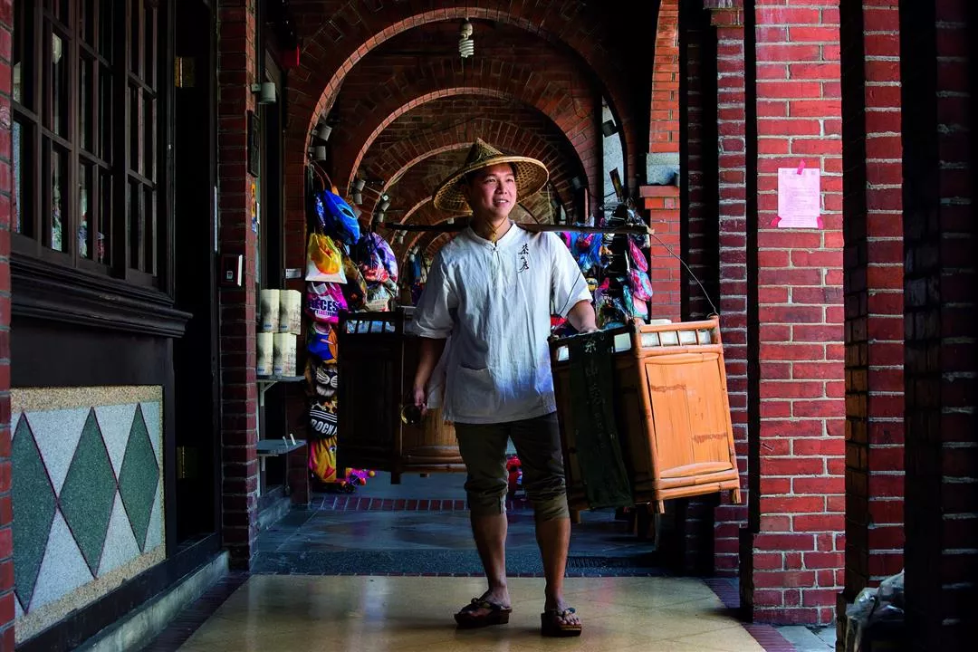 「茶山房」的員工著裝挑著擔子,在三峽老街上表演古時叫賣肥皂的情景,頗具蘊意。