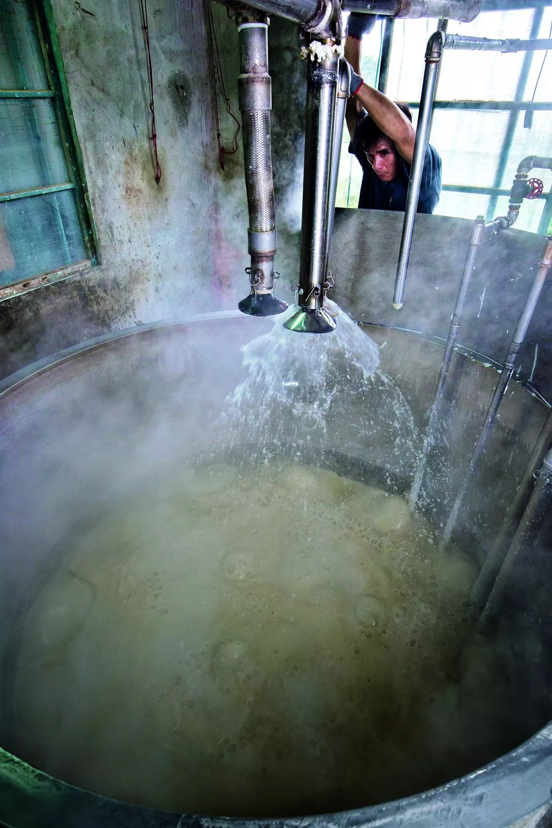 「茶山房」傳承自林家的老鍋爐中,白煙裊裊,依比例加入的油脂、水和石鹼正在沸滾,經驗老道的員工適時灑水降溫,監控品質。