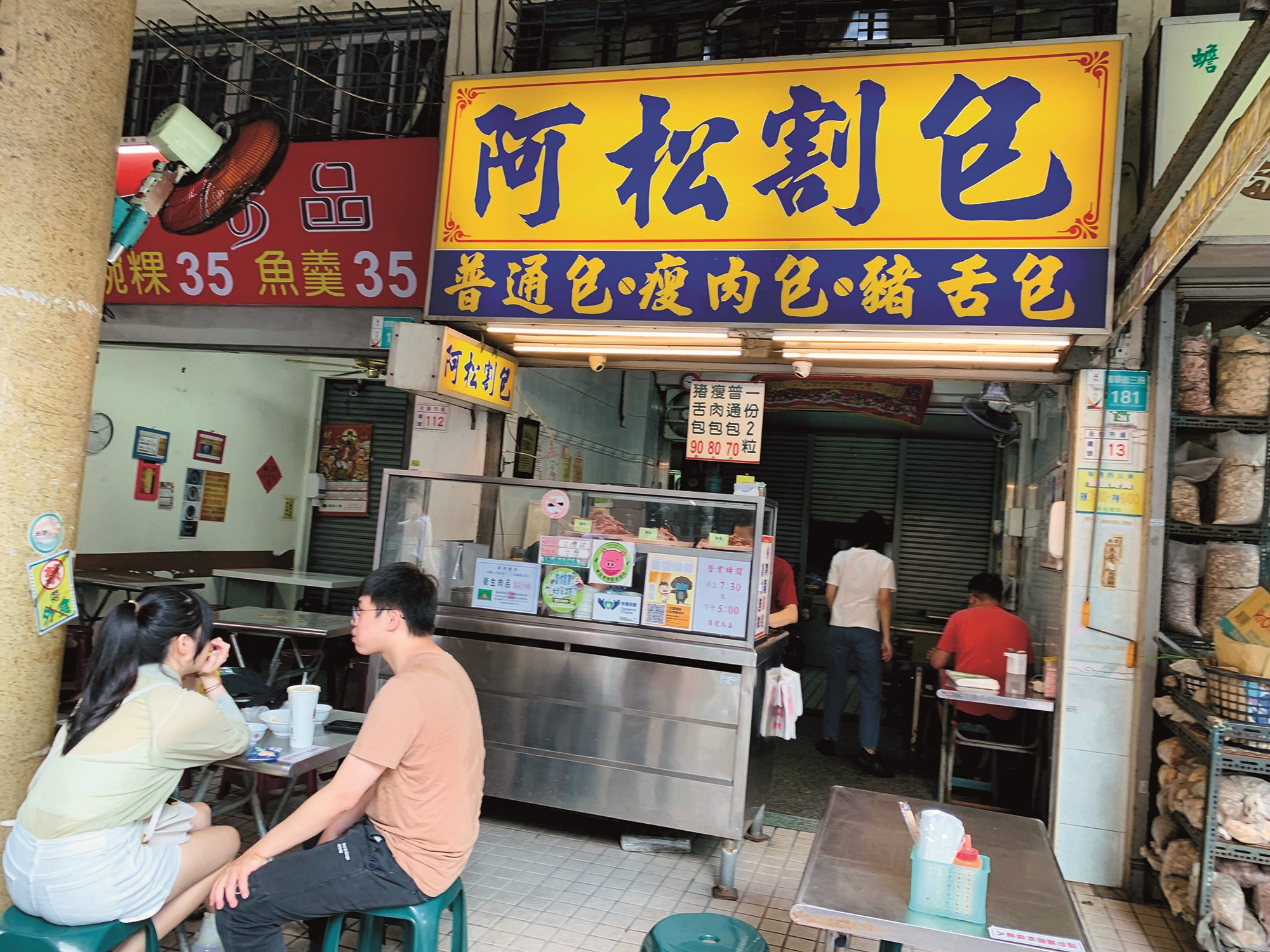 國華街接近民族路的這一端,也有很多小吃名店,被稱為「台灣漢堡」的「阿松刈包」就是其中之一。阿松刈包分豬舌包、瘦肉包及普通包三種,普通包就是以豬頭肉為主,含油脂多,爽口不油膩;豬舌包以整塊燉煮好豬舌肉夾在兩片蓬鬆的饅頭皮內,不用坊間常見的花生糖粉,而是淋上特製微甜的花生醬,口味獨到,讓人一口接著一口,欲罷不能。
