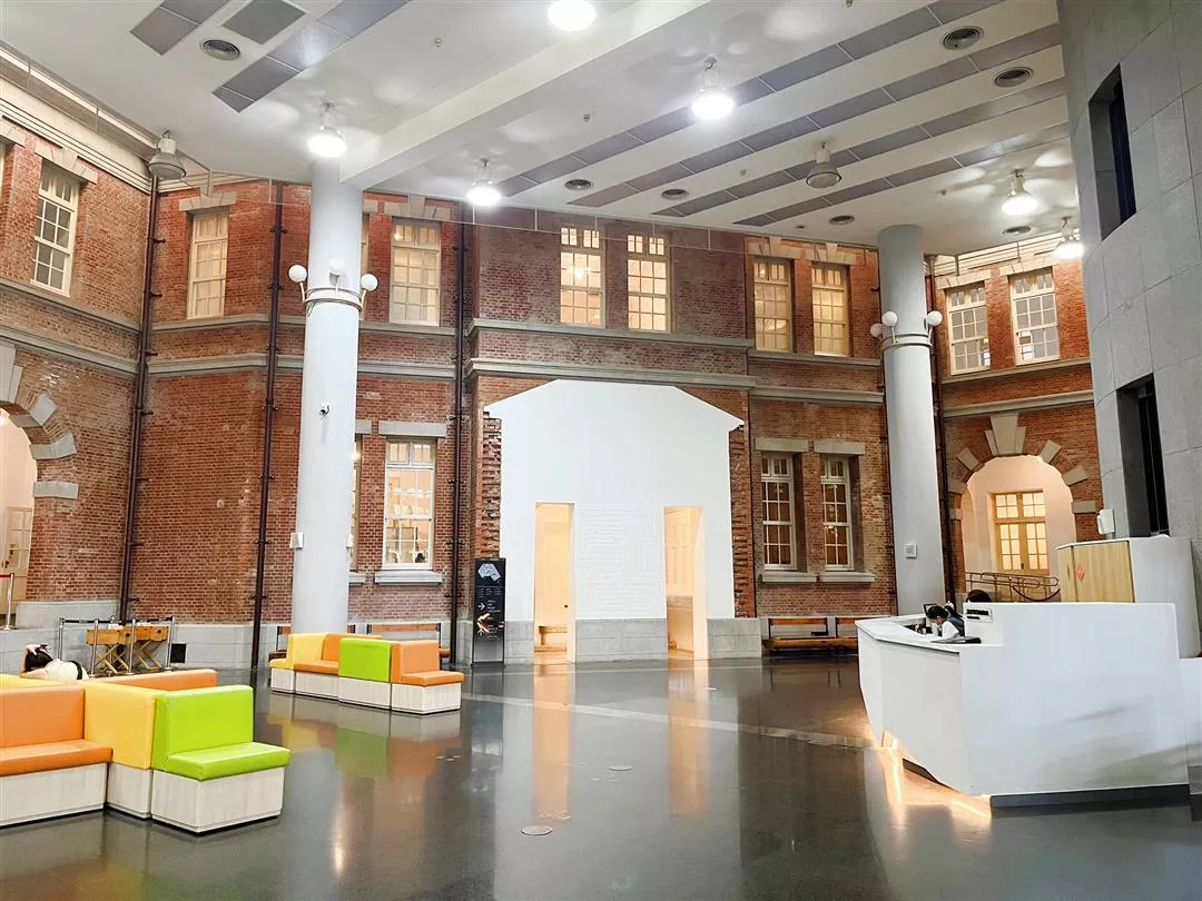 舊州廳的紅磚牆與新建築共同塑造臺文館藝文大廳。而紅磚牆上整面白色油漆的部分,標誌著舊州廳被拆除的一個小空間的位置,呈現新舊共融與歷史標記。(林韋言攝影)