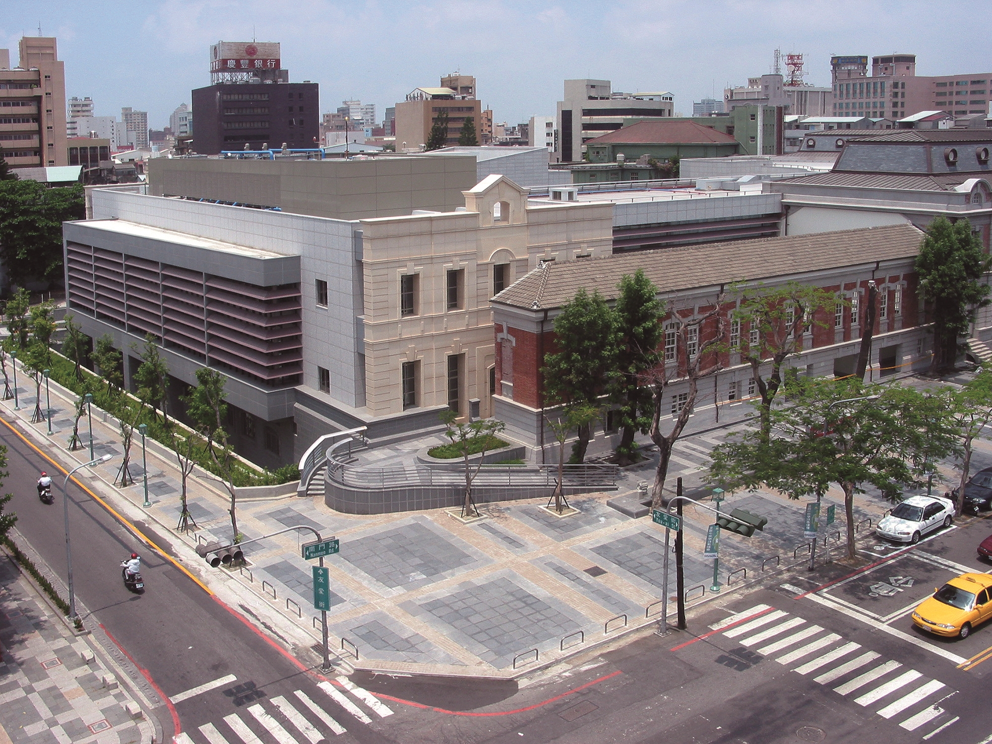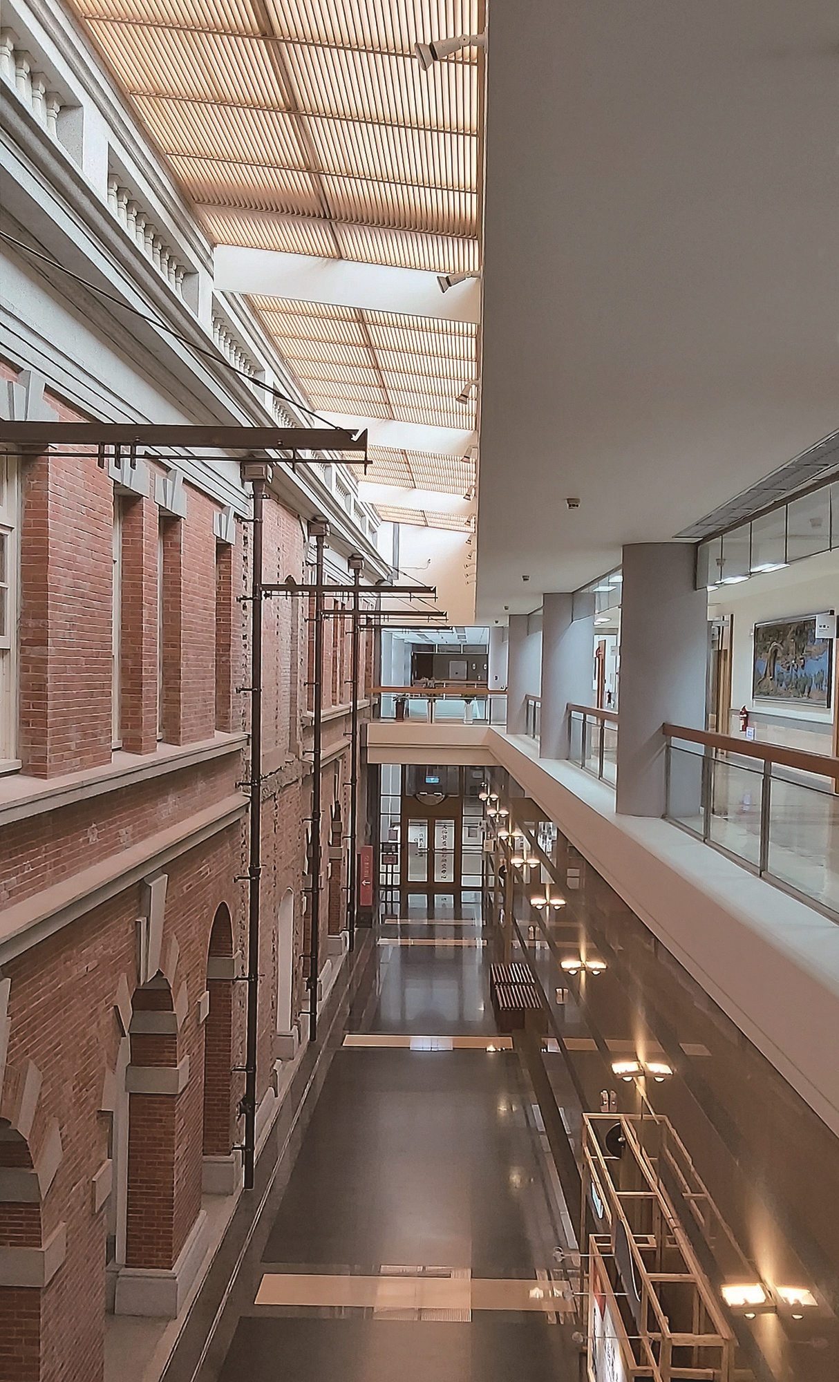 舊州廳的紅磚牆與新建築共同塑造臺文館藝文大廳。而紅磚牆上整面白色油漆的部分,標誌著舊州廳被拆除的一個小空間的位置,呈現新舊共融與歷史標記。(林韋言攝影)