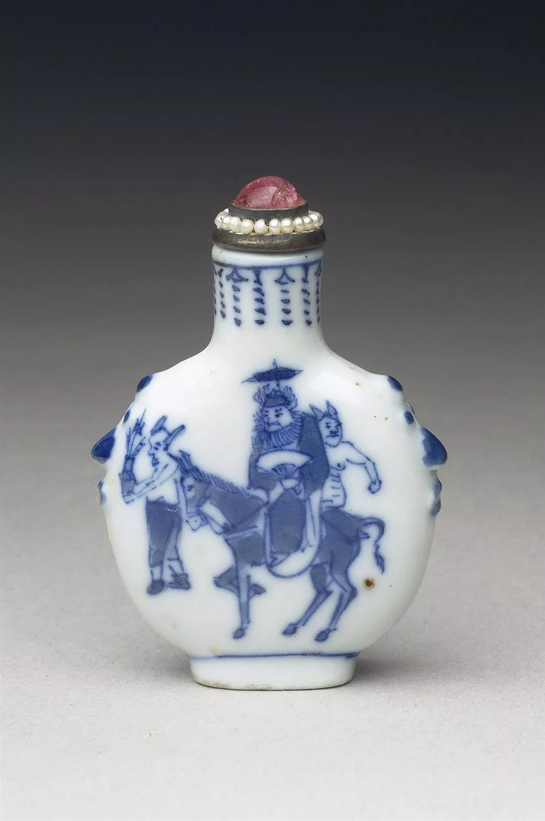 鍾馗以正氣與威勢著稱,專司驅邪除妖。展出的〈午日鍾馗〉,由吳派畫家錢穀於1563年所繪,形象剛烈、氣勢逼人。隨著民間信仰發展,鍾馗更與端午節習俗相連,出現在青花瓷與套紅玻璃鼻煙壺等工藝作品上,延續護佑與辟邪的象徵。