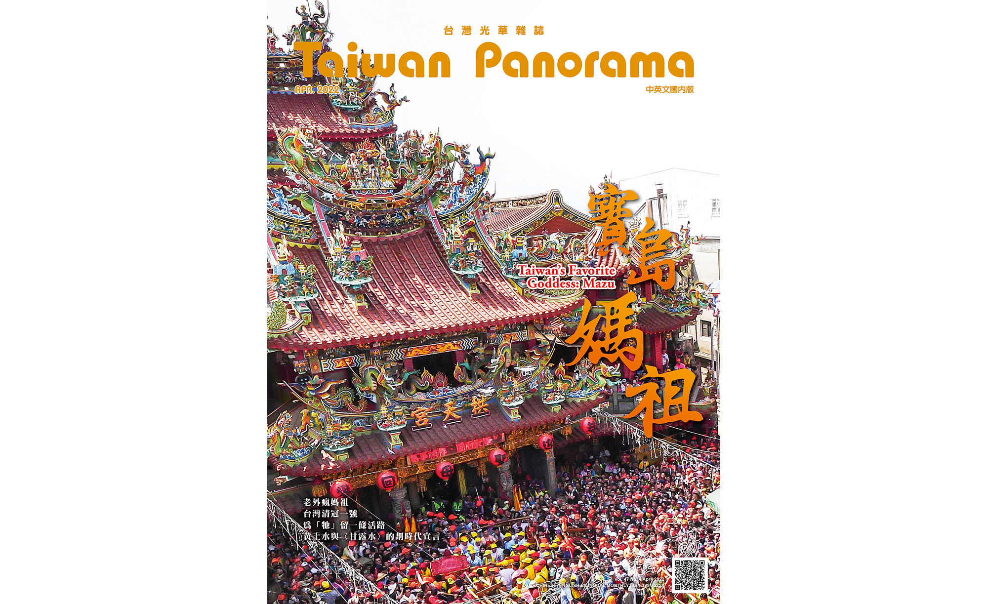 2010年文化部文化資產局登錄「大甲媽祖遶境進香」、「北港朝天宮迎媽祖」、「白沙屯媽祖進香」為我國國定的重要民俗活動。本期《光華》封面故事將以媽祖在台之獨特性、具代表性之建築工藝、朝聖影像之經典時刻,以及外國人士的進香體驗等,呈現出媽祖文化在台延續至今之樣貌。