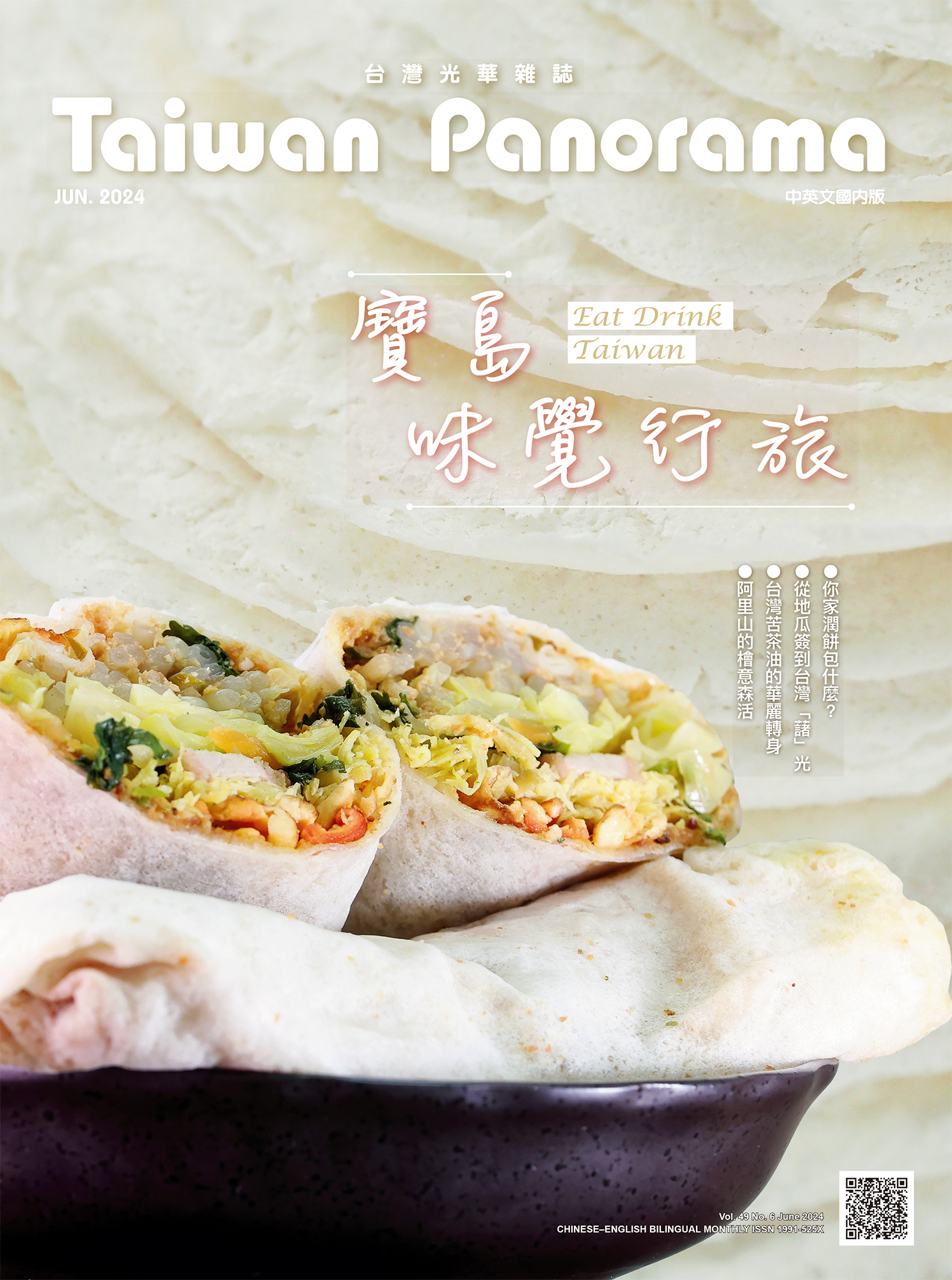 物產豐饒之台灣,在歷年來族群融合及飲食文化的刺激下,發展出各種蘊藏在地風土之獨特滋味。本期《光華》封面故事從一口吃進地方產物的潤餅、常民米食點心(鬆糕、狀元糕),以及特色酒吧和補身茶飲(冬瓜茶、菊花茶),邀請外國友人來台灣進行一場極富在地風味的味覺行旅。
