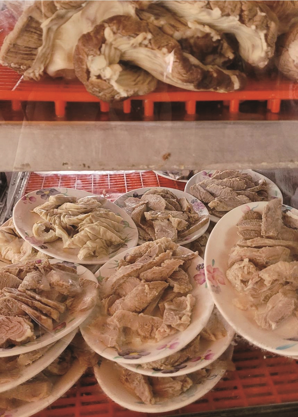 這些都是滷味,跟日後成年痴迷的黑白切並不相同,主要是,並沒有純粹的肉。我見到的肉,就是切仔麵上頭那片水煮抹鹽巴白切肉。在此之前,我吃過的白切肉幾乎都是拜拜後隔頓才吃的復熱肉;媽媽用外婆教的爆炒方式復熱祭拜過的白切肉,加了蒜頭、蔥段和醬油,鹹香下飯,我已經視為天堂級別的珍饈。後來在麵攤吃到切仔麵附贈的這一小片鮮煮現切的白切肉,才曉得自己見識過分淺薄。