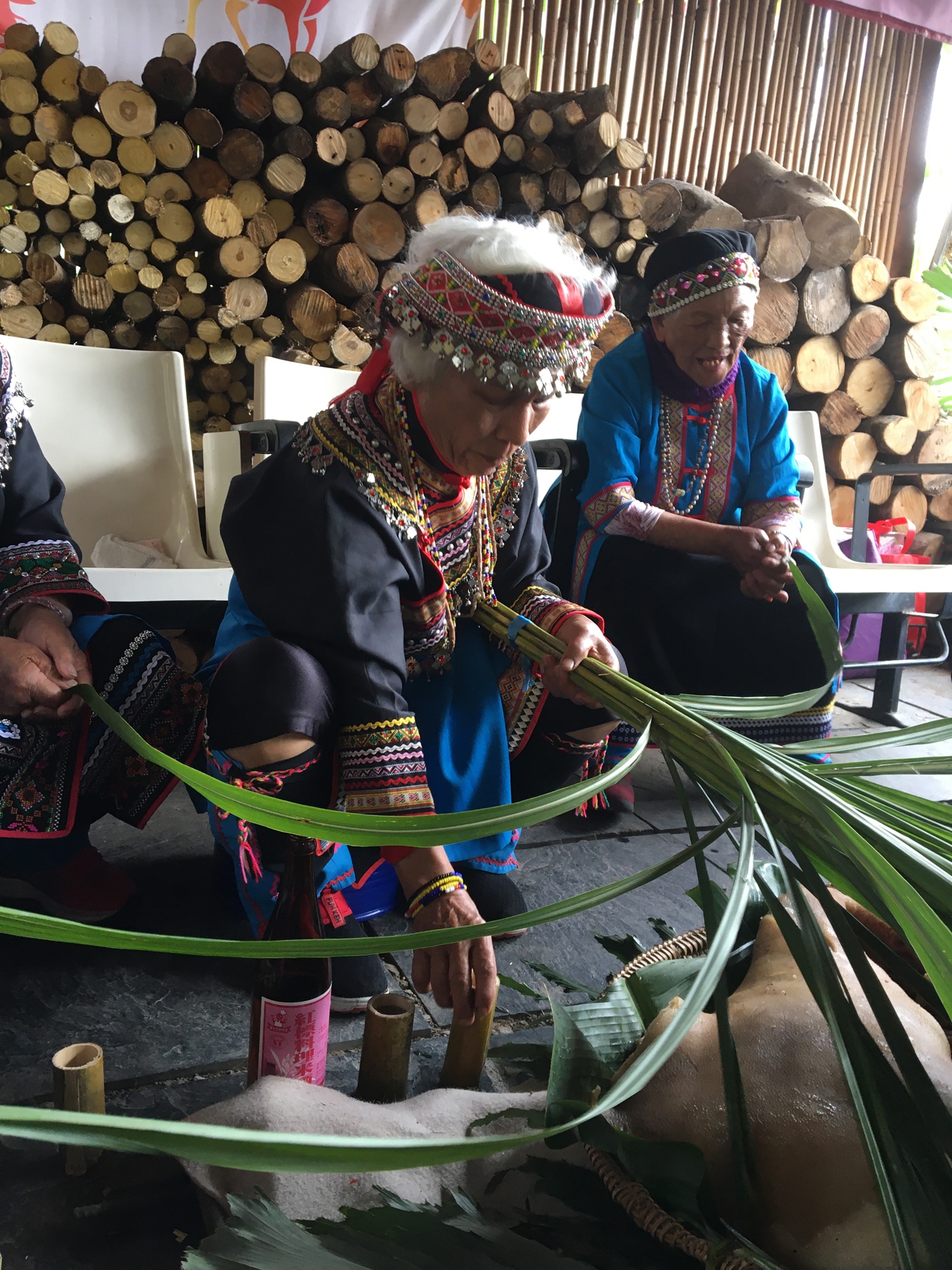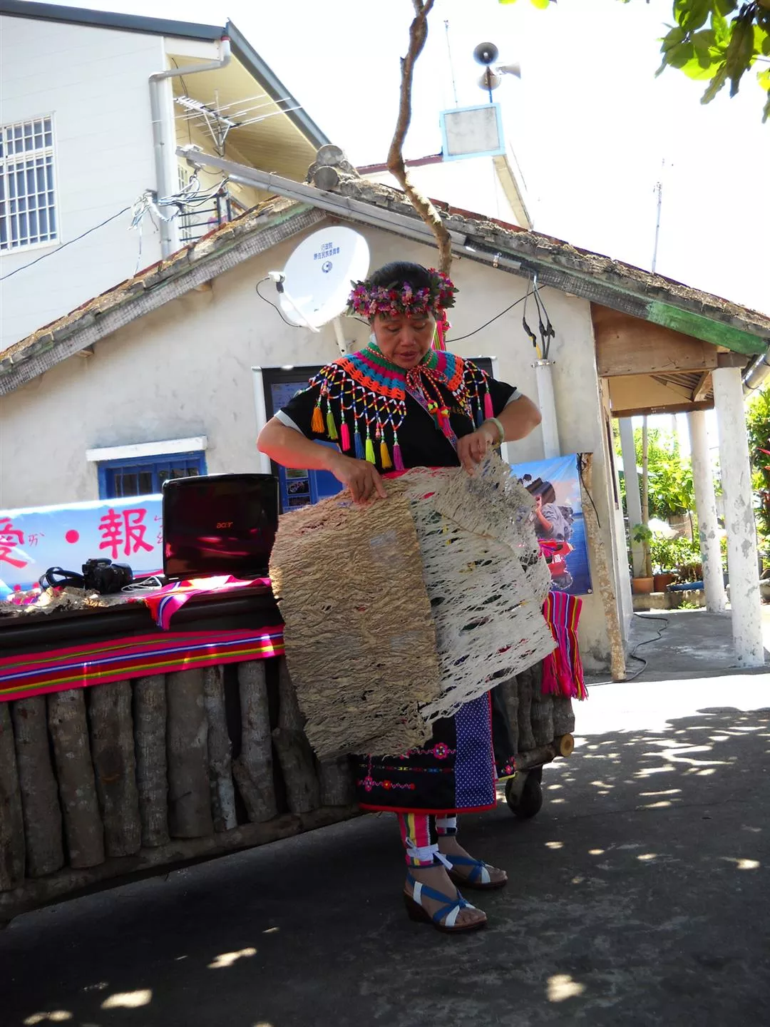 阿美族都蘭部落婦女展示構樹的樹皮布。