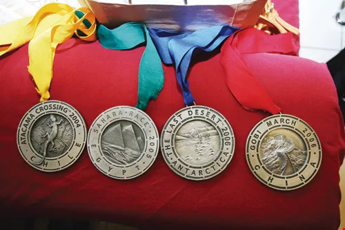林義傑參加極地比賽所獲獎牌。左起2004「智利阿他加馬寒漠超馬」、2005「埃及撒哈拉超馬」、2006「南極超馬」,2006與美國查理、加拿大雷伊組成3人團隊,參加第四屆「戈壁超馬」。